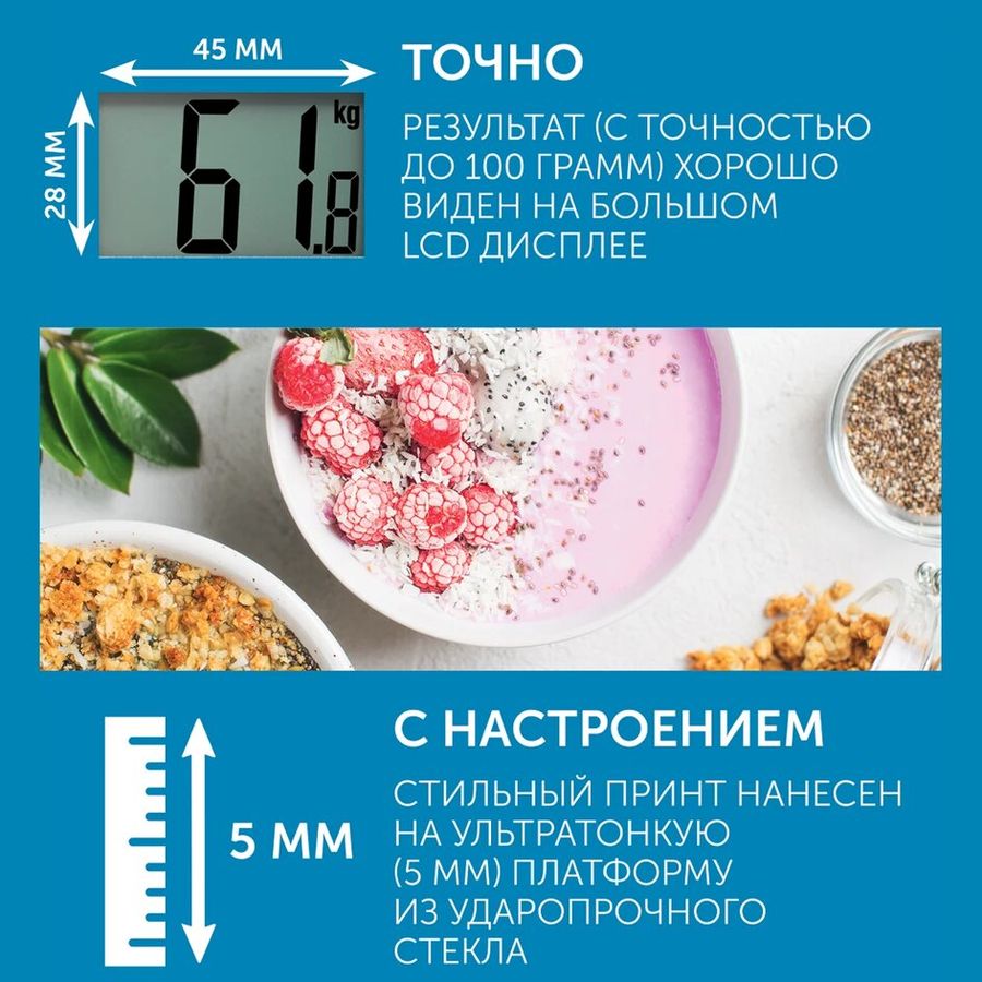 Простой и удобный способ контролировать свой вес! Благодаря высокочувствительным датчикам погрешность составит не более одной цены деления. А приятное цветовое решение c металлическим эффектом позволят прибору не только вписаться в любой интерьер, но и радовать глаз каждый день!