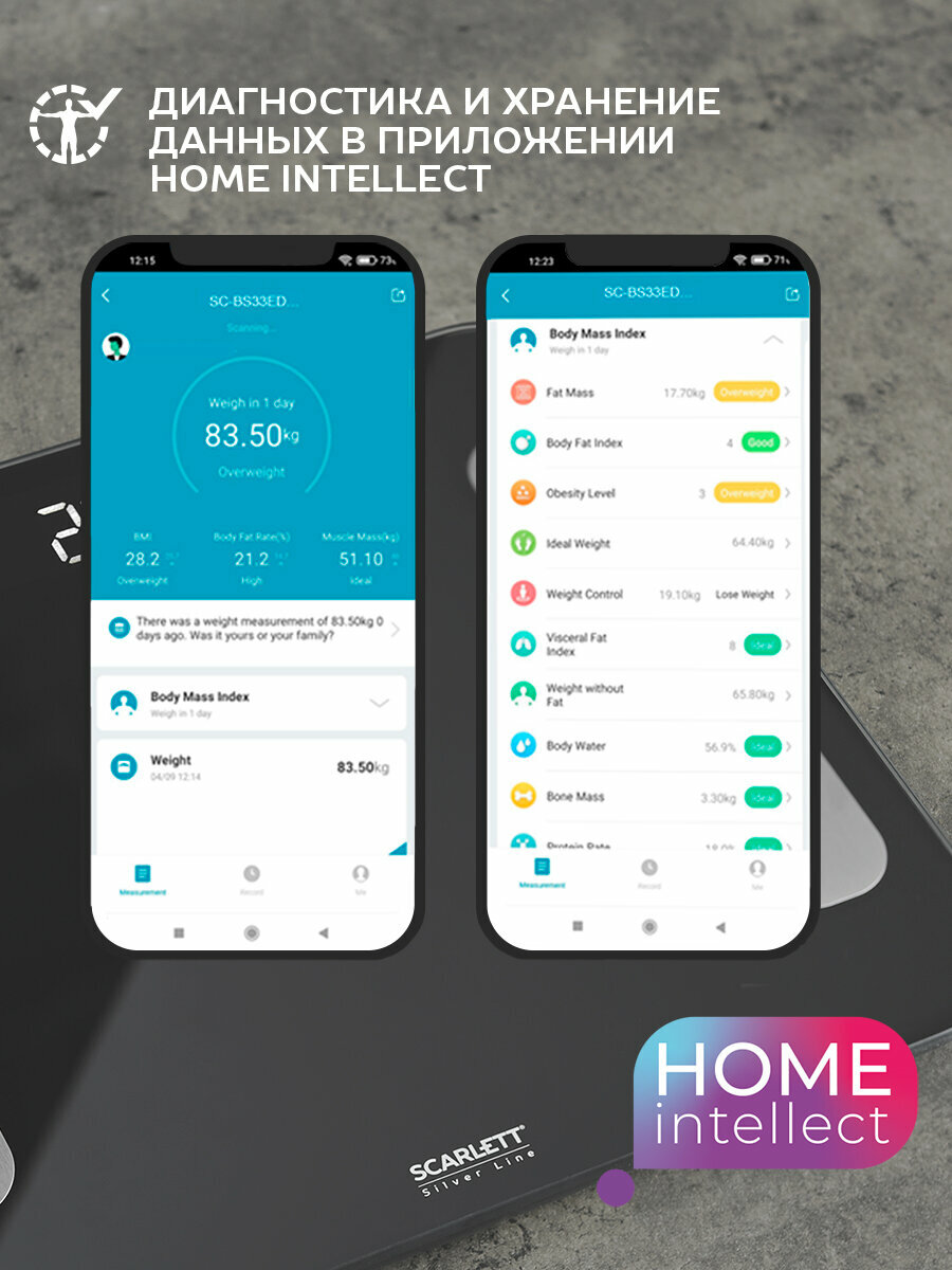 Измерения параметров тела: Вес, Динамика веса, Жировая масса, Костная масса, Индекс массы тела, Висцеральный жир, Содержание воды