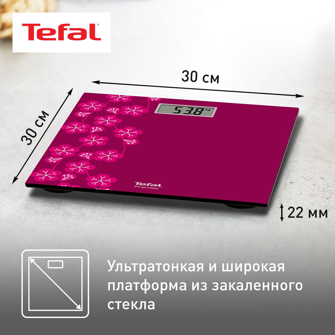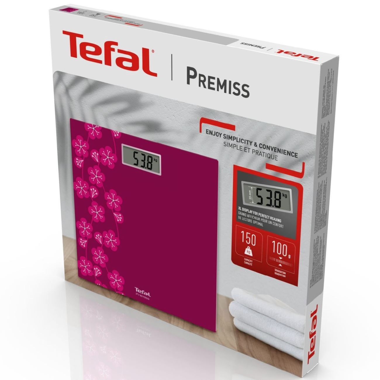 Tefal Premiss – это электронные напольные весы, которые удобно и легко использовать каждый день. Благодаря функции автоматического включения и выключения достаточно только встать на весы, чтобы они «проснулись» и показали ваш точный вес. Платформа весов выполнена из закаленного стекла в экстрашироком и ультратонком дизайне с хорошо читаемым LCD-дисплеем и высоким пределом взвешивания – до 150 кг с точностью до 100 г. После использования весы легко чистить и удобно хранить. В комплект входит литиевая батарейка, поэтому весы можно использовать сразу после покупки.