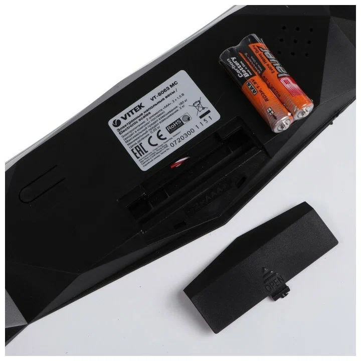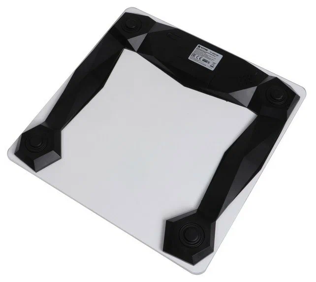 Батареи в комплекте, платформа из закаленного стекта толщиной 5 мм, ЖК дисплей 75*35 мм с белой подсветкой, прорезиненные ножки, сенсорный экран, автоматическое выключение, автоматическое включение, индикатор уровня зарядки, индикация перегрузки, разрядка батарей, материал корпуса - пластик