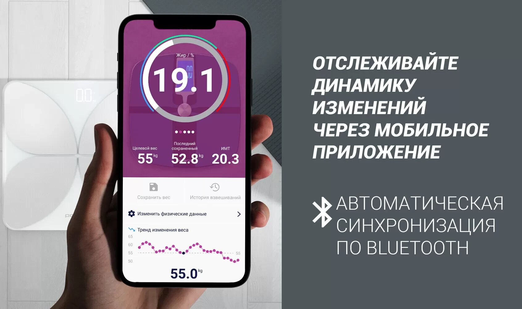 Подключив весы к телефону, вы можете измерить не только свой вес, но и индекс массы тела, массу жира, мускулов, воды и костей (биоимпедансный анализ).