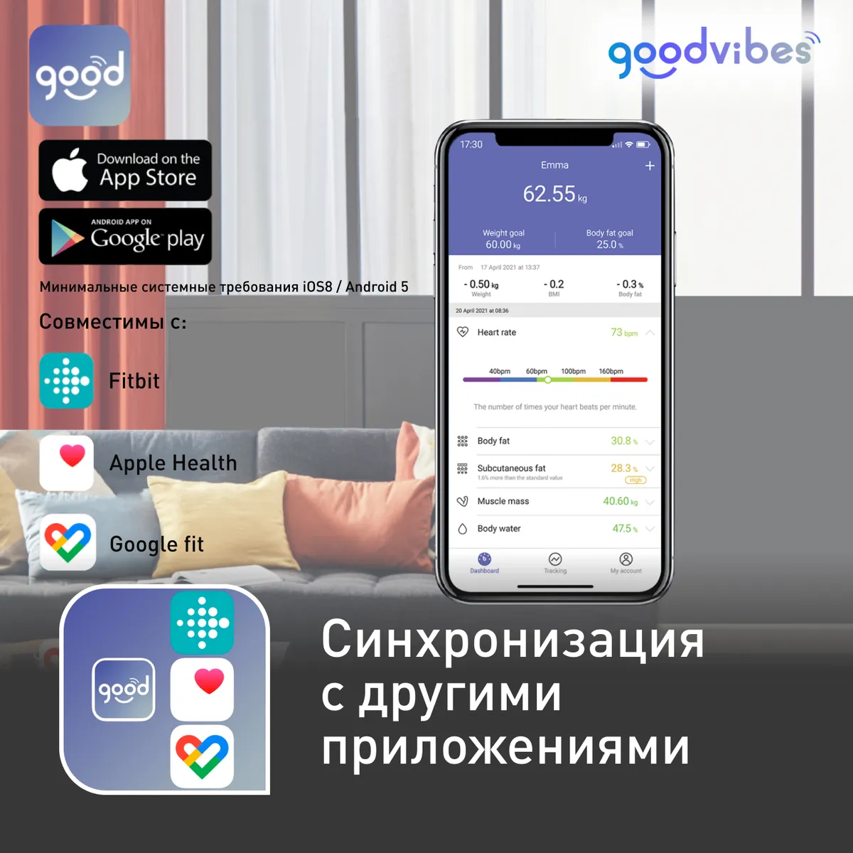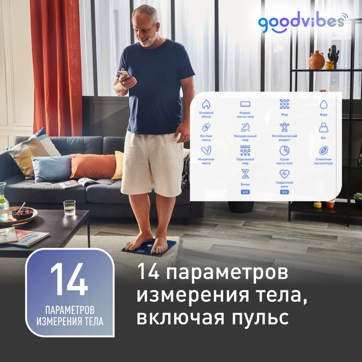 Ваше тело – уникально. Возраст, тип телосложения, цели в отношении здоровья – нет двух одинаковых людей. Умные весы Goodvibes с интуитивным приложением помогают лучше узнавать себя, ставить правильные цели и заботиться о своем здоровье благодаря 14 показателям тела, включая ИМТ, жировую и мышечную массы, костную массу, количество воды в организме, метаболический возраст и пульс. Удобное приложение наглядно показывает динамику и позволяет отслеживать ваш прогресс, устанавливать цели по идеальному весу и жировой массе и достигать их. Электронные весы Goodvibes созданы для всех без исключений – они не имеют лимита по количеству пользователей, поэтому ими можно пользоваться всей семьей, а также выдерживают до 180 кг и показывают вес с точностью до 50 г.