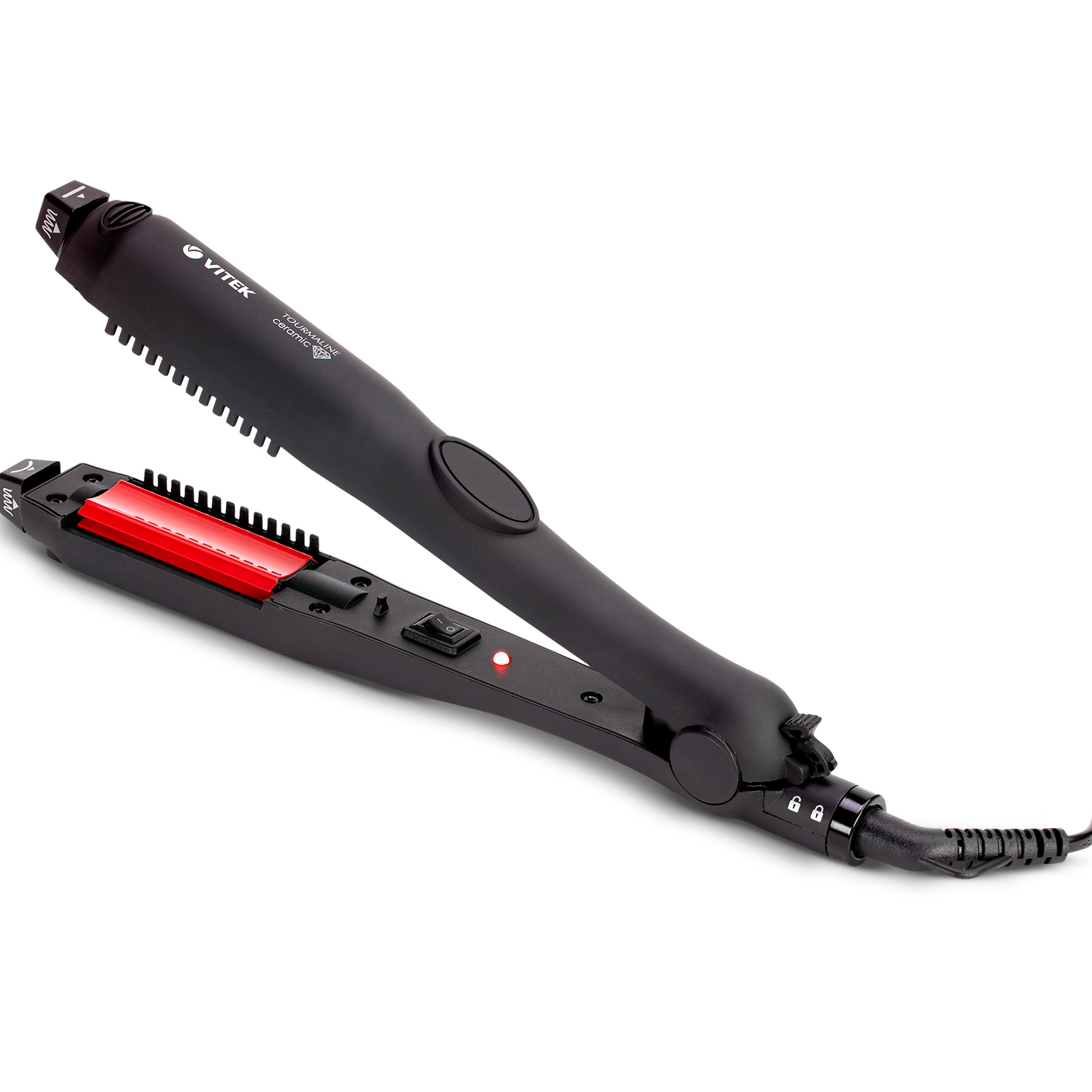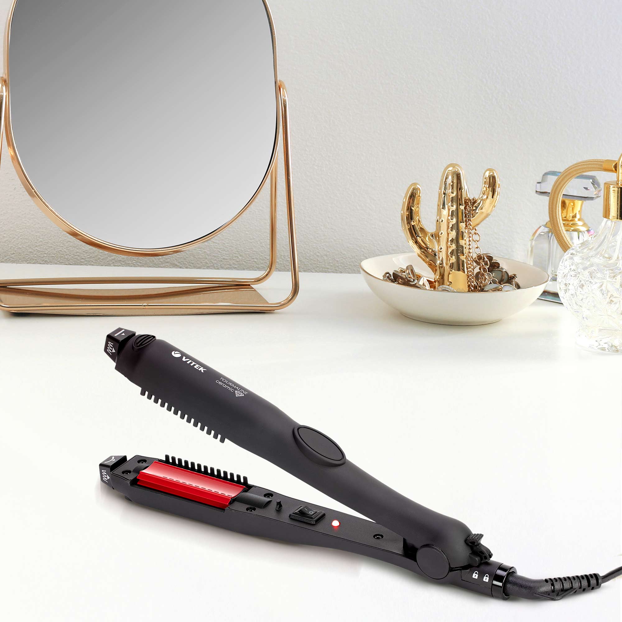 Тем, кто любит менять свой облик, создавая разнообразные прически, подойдет мультистайлер VITEK VT-8435. Для этого прибора 4 в 1 практически нет ничего невозможного в мире парикмахерского искусства! Он способен выпрямить волосы, завить их в мелкое или крупное гофре, а также создать эффектные 3D-локоны. Благодаря вращающемуся шнуру, пользоваться прибором очень удобно. Пластины мультистайлера имеют керамическое покрытие Tourmaline Ceramic, которое снимает статическое электричество и «запечатывает» чешуйки волос. Технология PTC Heating позволяет быстро стабилизировать нагрев прибора (максимальная температура — 220°С). В результате вы получаете красивую прическу, а волосы остаются здоровыми и крепкими.