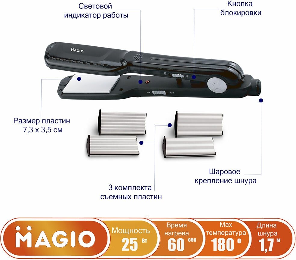 Мультистайлер MAGIO MG-679 — универсальный прибор для создания ярких образов. Сменные керамические панели легко вынимаются и вставляются. В наборе крупное и мелкое гофре и утюжок. Они нагреваются равномерно и делают прическу в щадящем режиме. Корпус изготовлен из прочного черного пластика, устойчивого к высоким температурам. Нагрев до 180 °С осуществляется за несколько секунд, и устройство готово к работе. Пластины удлиненные, что обеспечивает быструю укладку. Шнур с шарнирным креплением не перекручивается во время работы, а петля для подвешивания упрощает хранение прибора.
