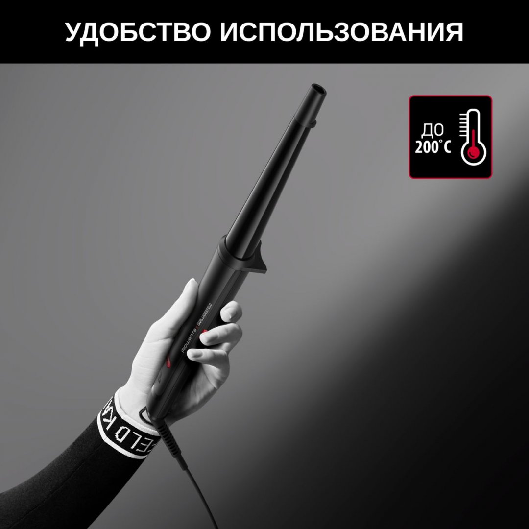 За счет термоизолированного наконечника снижена вероятность получения ожогов. За счет небольшой подставки предотвращается повреждение поверхности туалетного столика или полки нагретым устройством. Электрощипцы конические Rowenta Karl Lagerfeld Conical Wave CF324LF0 произведены из материалов высокого качества и характеризуются долговечностью службы. Благодаря шарнирному креплению сетевой провод не скручивается, что обеспечивает свободу движений пользователя.