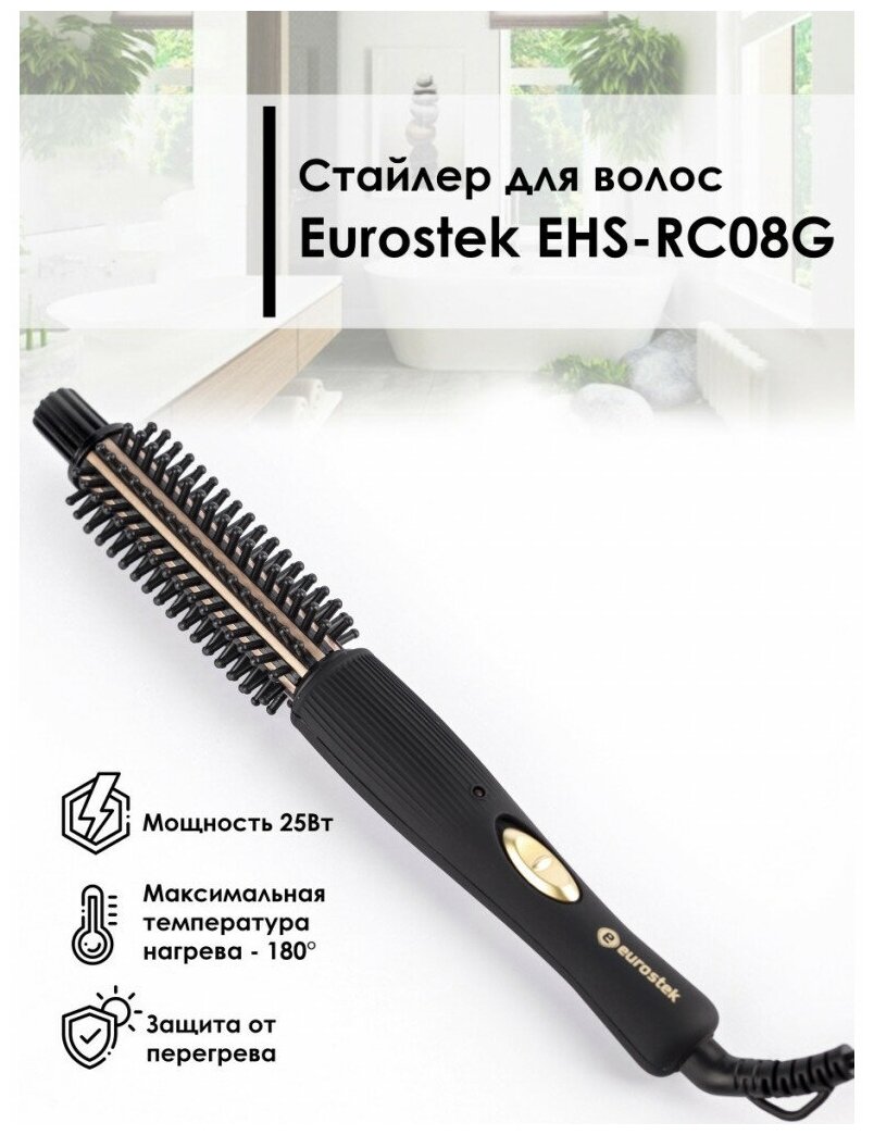 Стайлер для волос Eurostek EHS-RC08G имеет максимальную температура нагрева 180° и функцию защиты от перегрева. Поворот шнура на 360° позволяет избежать перекручивания.