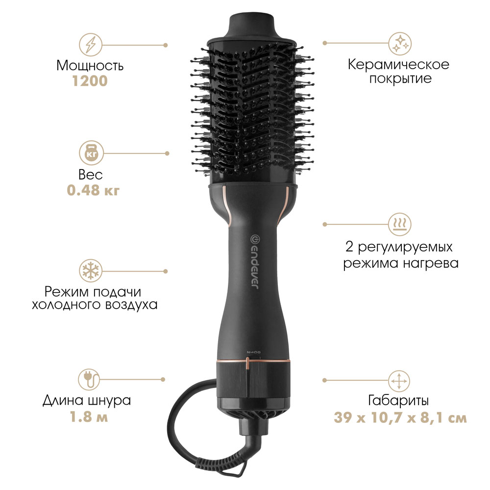 Керамическое покрытие, Режим подачи холодного воздуха, Два регулируемых режима нагрева, Комбинированные щетинки без спутывания волос, Шарнирное вращение шнура на 360°, Удобная петелька для подвешивания, Безопасный наконечник