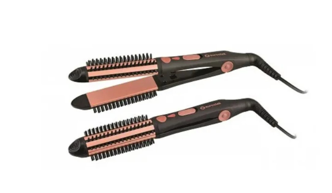 Стайлер для волос 3 в 1 Eurostek EHS-RC07G включает в себя три функции: выпрямление, завивка, укладка. Пластины с керамическим покрытием имеют размер 32x107 мм. Поворот шнура на 360° позволяет избежать перекручивания.