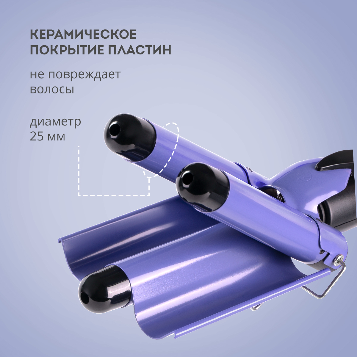 Рабочие поверхности диаметром 25 мм позволяют захватить большую прядь и моментально придать ей эффектную волну.