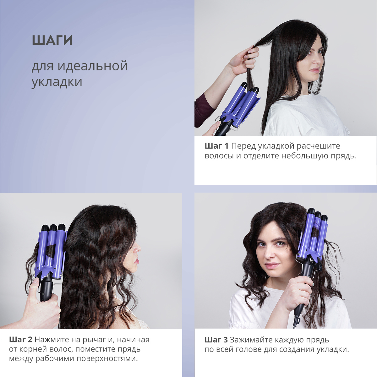 Особая форма тройного стайлера легко создает прически различных типов: