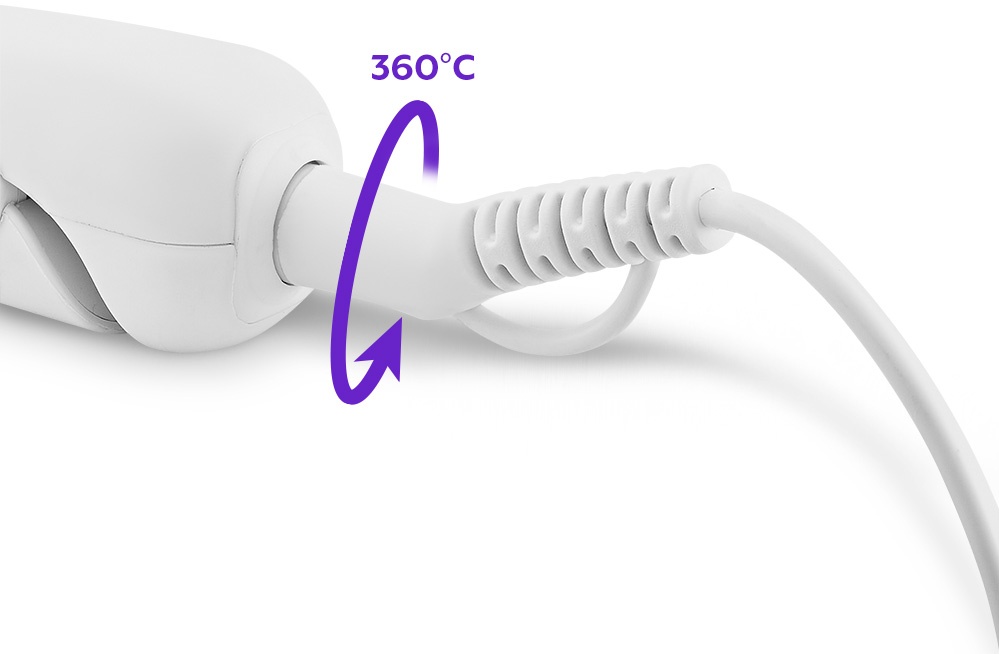 Шнур оснащён защитой от перегиба, что увеличивает срок службы прибора. На защите от перегиба находится петля для подвесного хранения. Вращение шнура на 360° обеспечивает удобство в использовании — провод не скручивается и не путается при повороте.