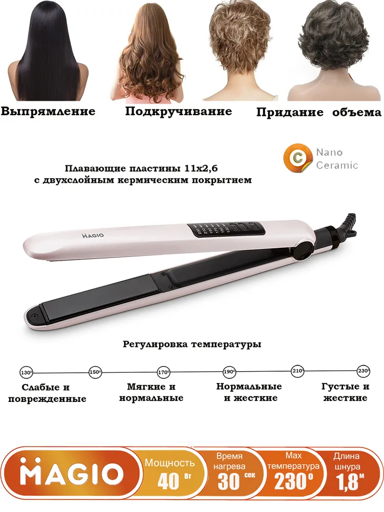 Выпрямитель Magio MG-600 позволяет за короткое время создать необходимую прическу как самостоятельно в домашних условиях, так и при помощи профессионала в салоне красоты или парикмахерской. Модель справляется даже с непослушными или вьющимися волосами, так как оснащена высококачественными нагревательными элементами с двухслойным керамическим покрытием и удобной плавающей пластиной.