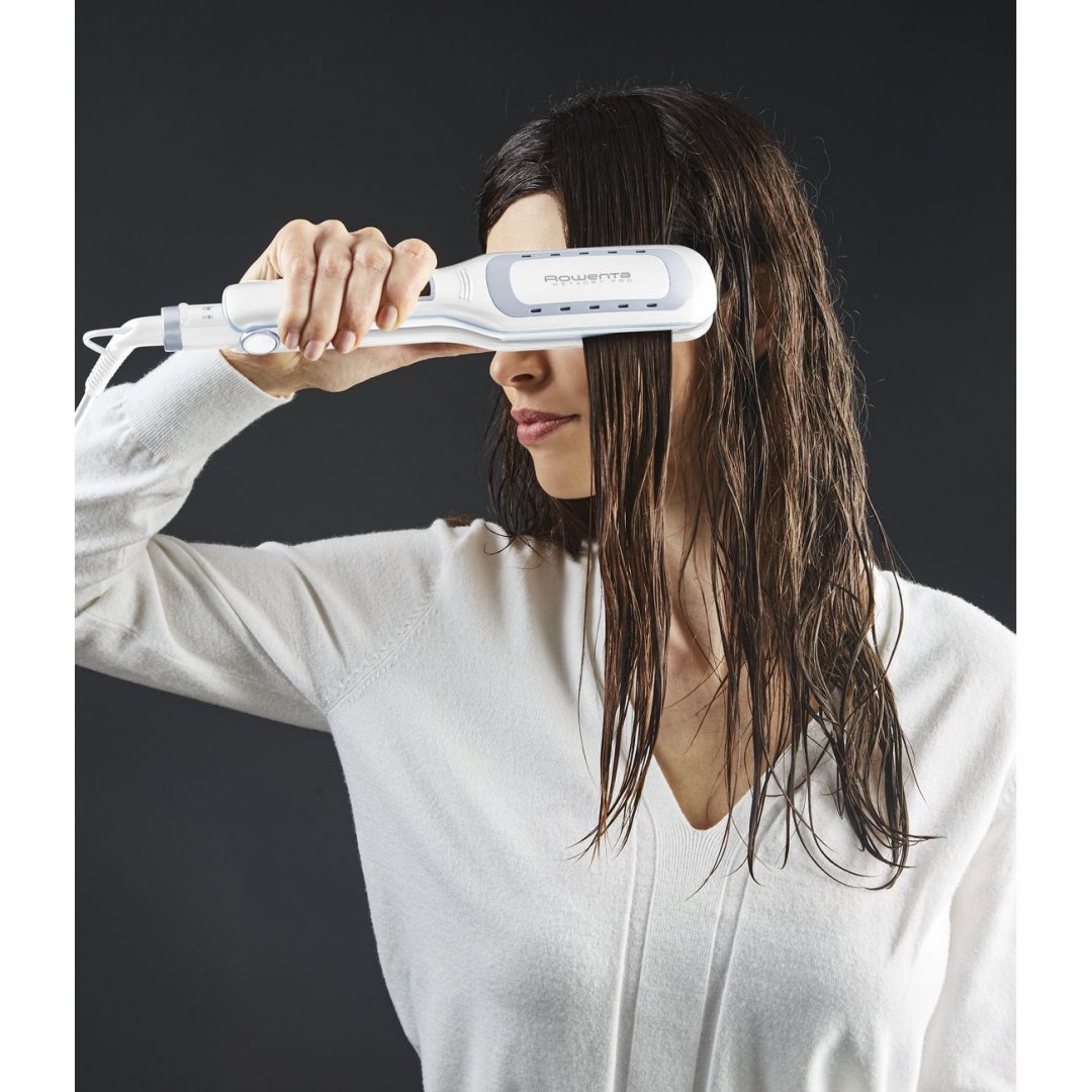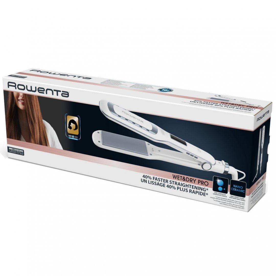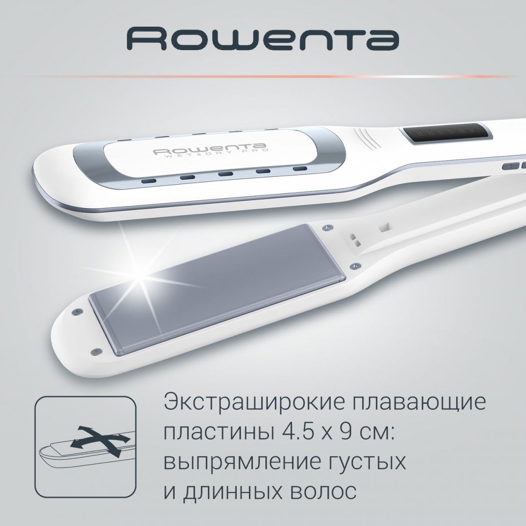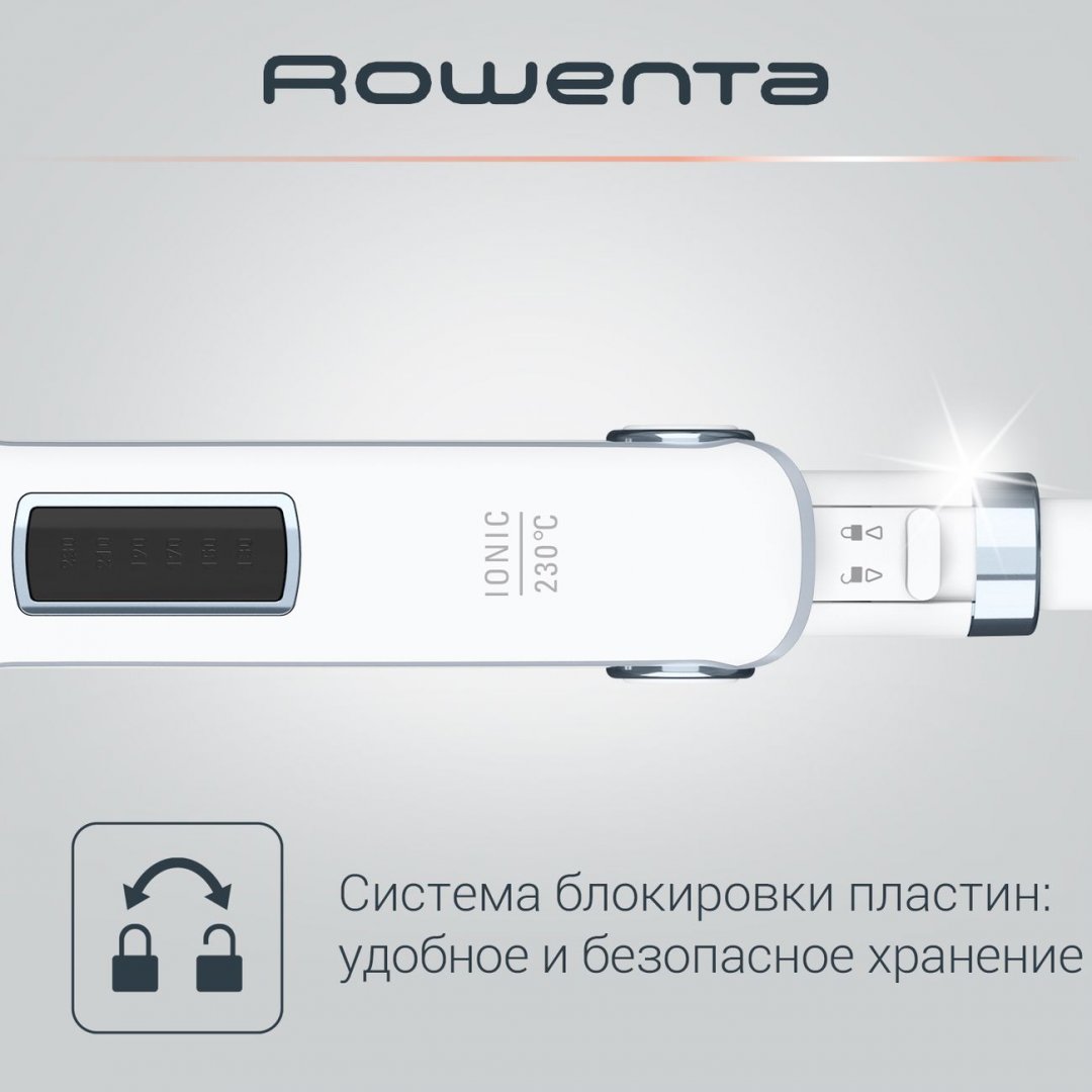 В конструкции устройства Rowenta Wet&Dry Pro SF5010F0 есть плавающие пластины. Благодаря этому исключено давление на пряди, волосы также защищены от случайного повреждения. Пользователь может регулировать температуру нагрева пластин за счет специальных ползунков на корпусе выпрямителя. Кнопка блокировки управления предотвращает случайное изменение настроек при работе с моделью.