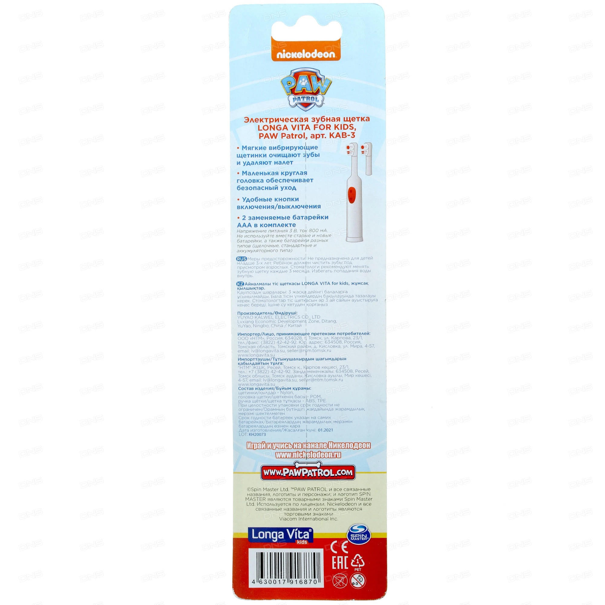 Благодаря яркому дизайну электрическая зубная щетка Longa Vita KAB-3 Patrol Pink привлечет внимание ребенка и поможет приучить его к регулярным гигиеническим процедурам. Вибрирующая насадка эффективно устраняет налет и вытаскивает мелкие частички пищи. А мягкие щетинки специально разработаны для чувствительных детских зубов и нежных десен. Устройство Longa Vita KAB-3 Patrol Pink оснащено широким округлым корпусом, который легко удерживать детской рукой. В комплекте идут 2 овальные насадки, которые следует заменять каждые 3 месяца. Также в упаковку добавлены батарейки AAA.