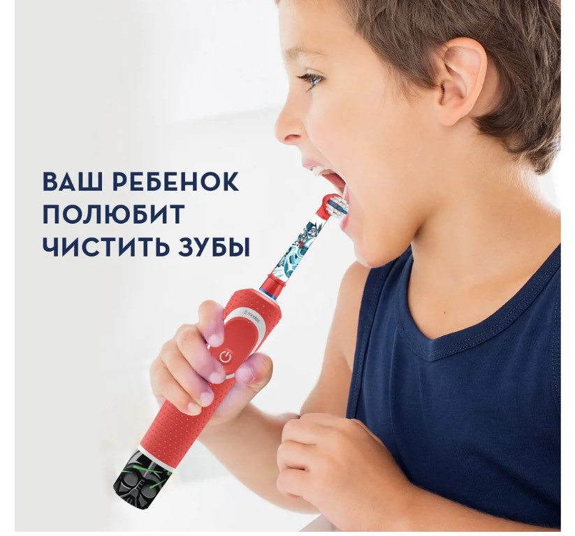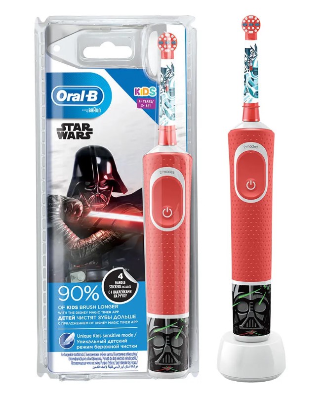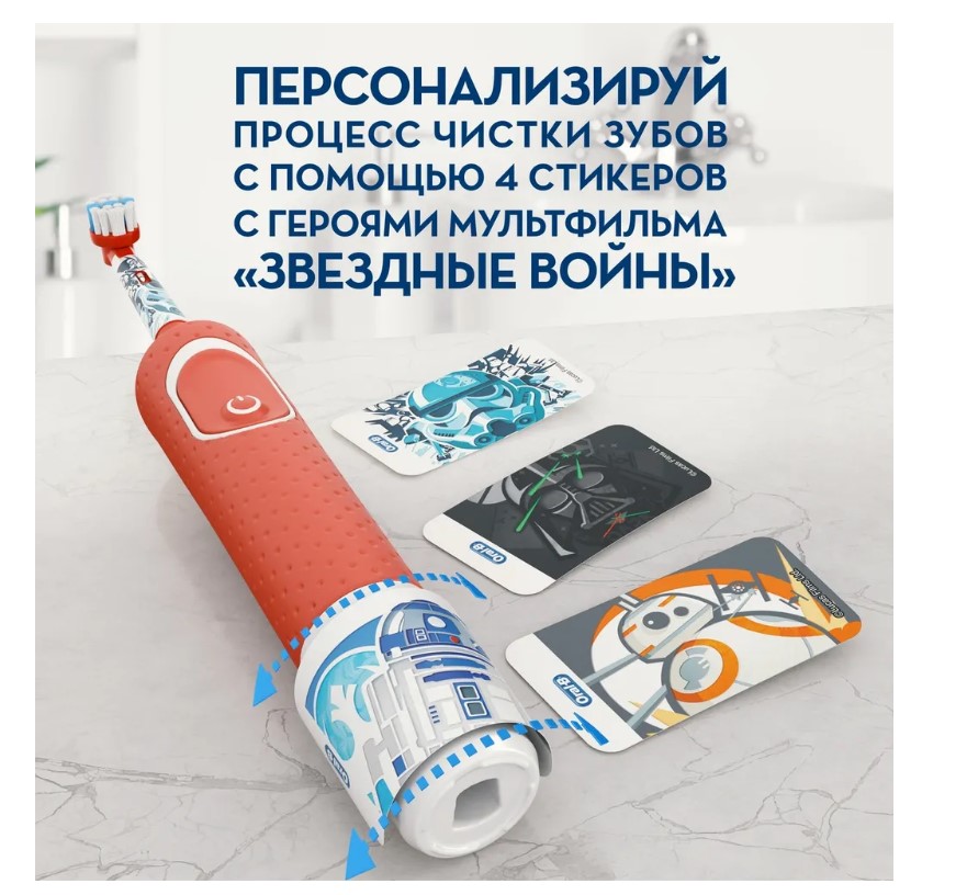Электрическая зубная щетка Oral-B Kids для детей от 3 лет с веселыми героями мультфильма "Звездные Войны" обеспечивает эффективный бережный уход за полостью рта ребенка от Oral-B. Она удаляет больше зубного налета по сравнению с обычной мануальной зубной щеткой. В комплект входят 4 стикера с героями мультфильма "Звездные Войны", с помощью которых можно персонализировать зубную щетку.•7600 возвратно-вращательных движений в минуту.