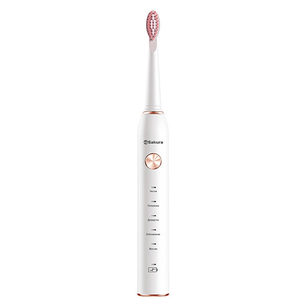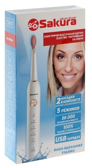 Электрическая звуковая зубная щетка, 38 000 колебаний в минуту, аккумулятор Li-ion 500 мAч, 5 режимов: чистка, полировка, деликатный режим, отбеливание, массаж, 2 насадки, автоматическая смена режимов через 30 сек, автоотключение через 2 минуты, USB кабель в комплекте.