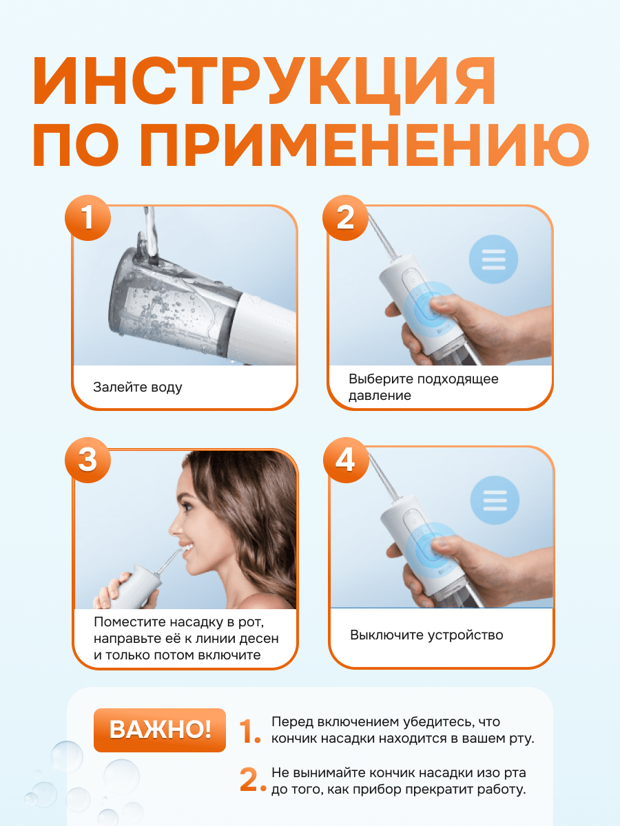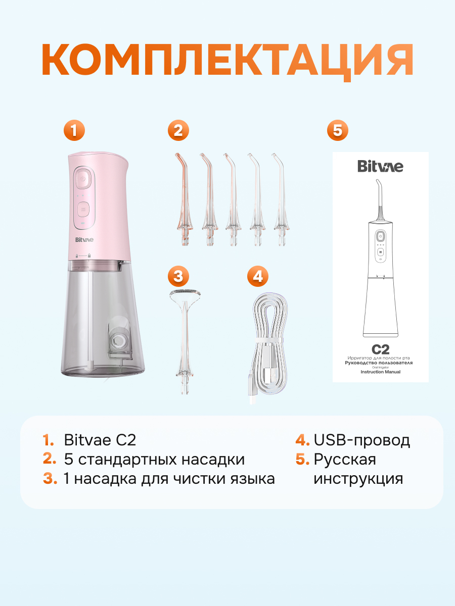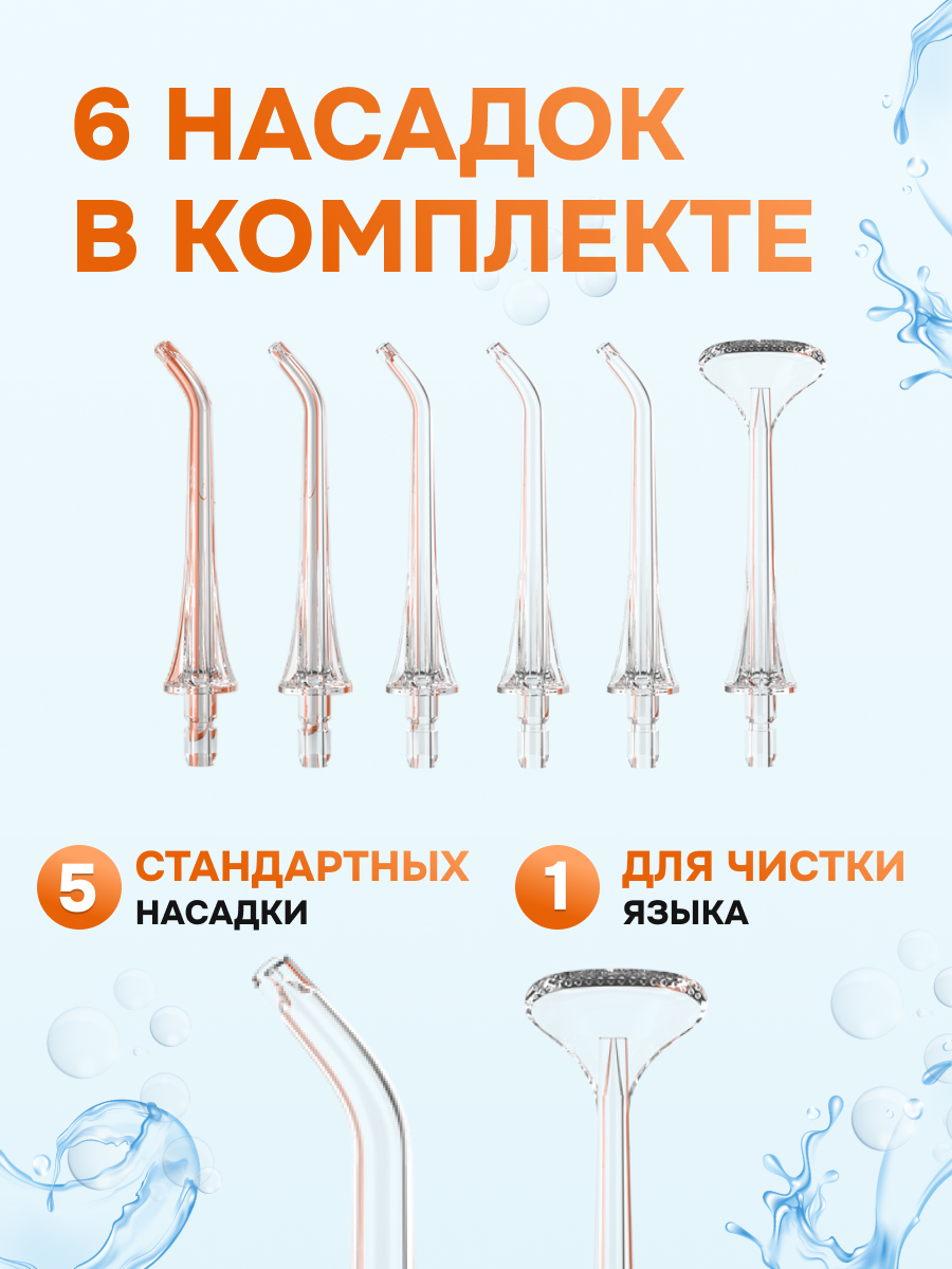 1*ирригатор для полости рта, 5*классических насадок, 1*насадка для чистки языка, 1*USB-кабель без адаптера, 1* Инструкция по эксплуатации