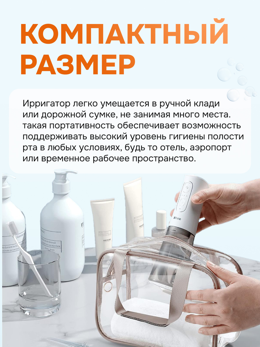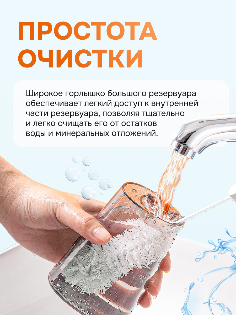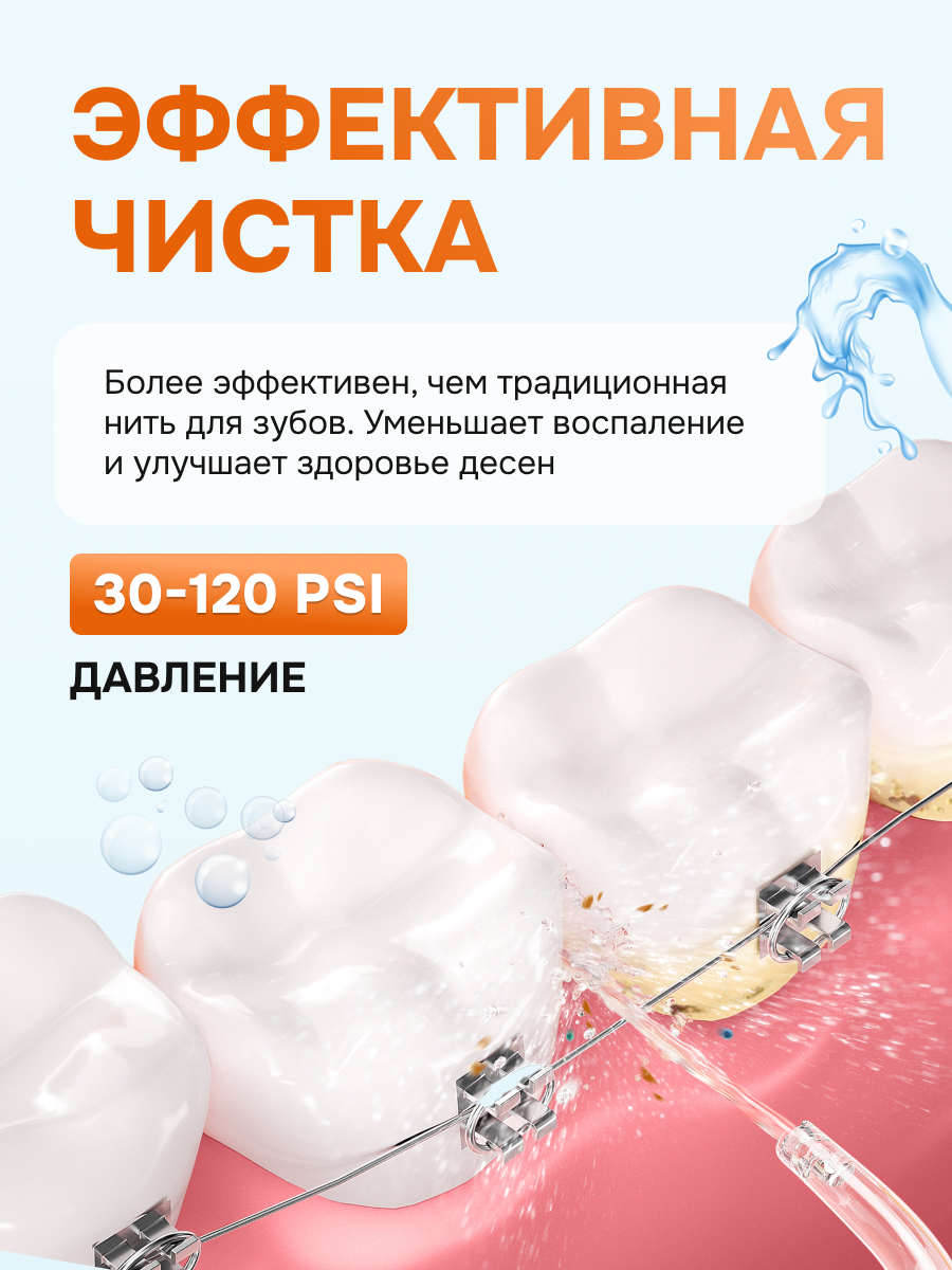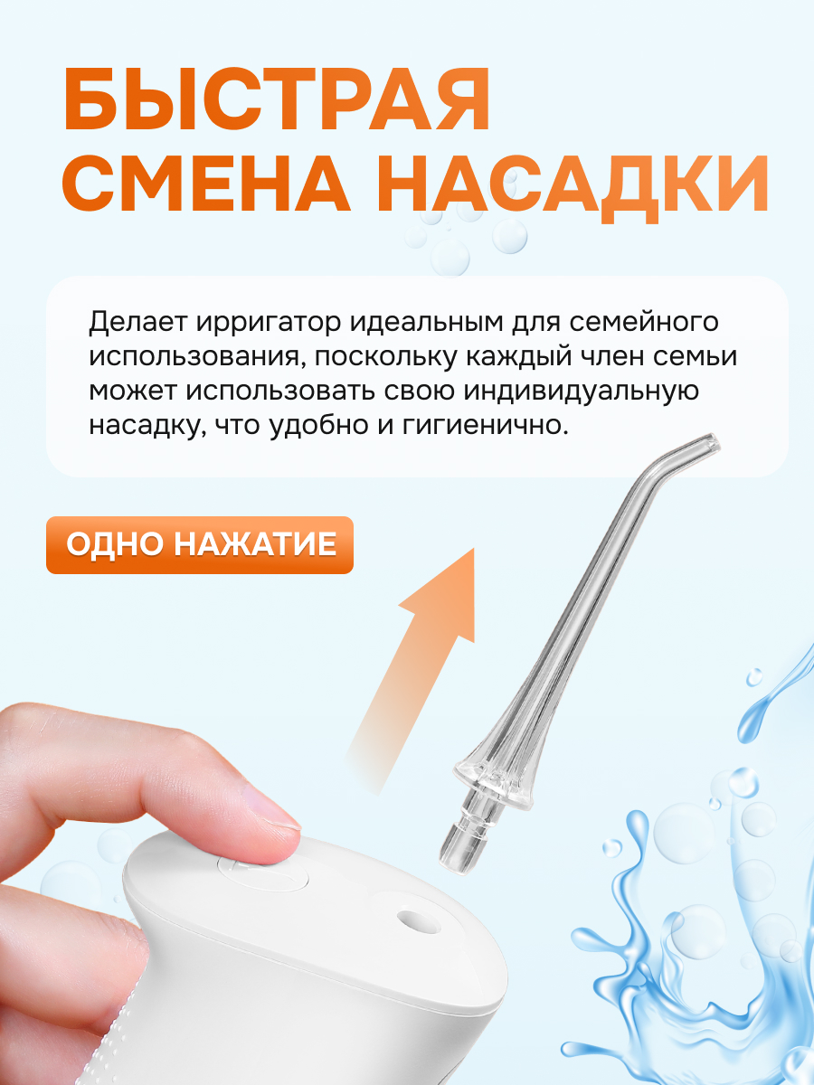 1*ирригатор для полости рта, 5*классических насадок, 1*насадка для чистки языка, 1*USB-кабель без адаптера, 1* Инструкция по эксплуатации