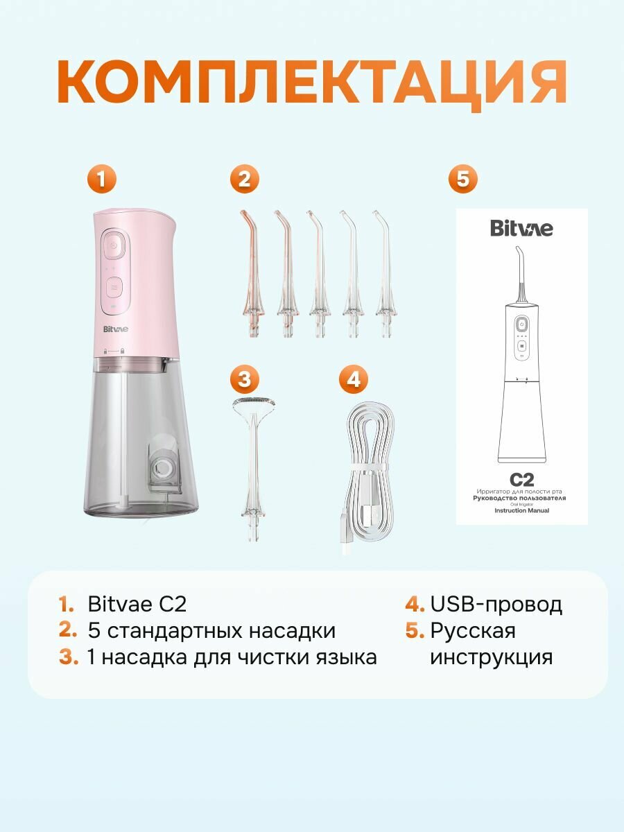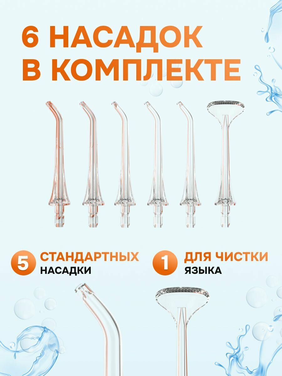 Комплектация: 1*ирригатор для полости рта, 5*классическая насадка, 1*насадка для чистки языка, 1*USB-кабель без адаптера, 1* Инструкция по эксплуатации.