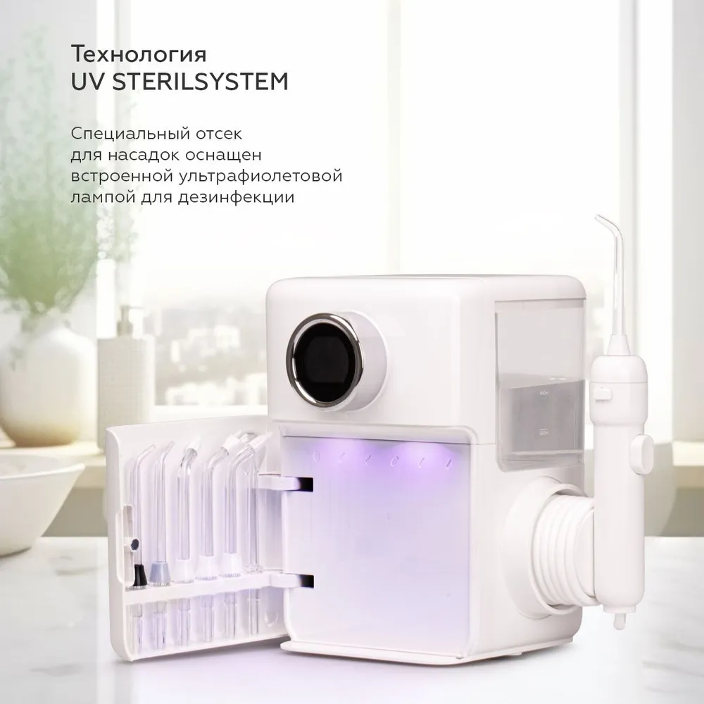 Емкость для воды имеет объем 800 мл. В комплектацию устройства входят 7 насадок, в том числе - специальная ортодонтическая и пародонтологическая насадки, насадка для удаления налета и чистки языка. Отсек для насадок оснащен ультрафиолетовыми лампами, осуществляющими дезинфекцию насадок после использования.