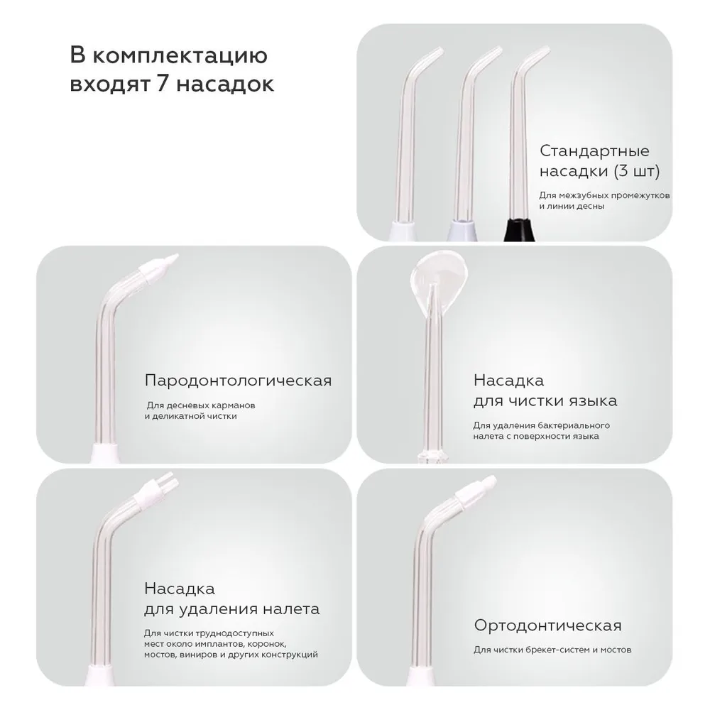 Ирригатор - 1 шт; Стандартные насадки - 3 шт; Ортодонтическая насадка - 1 шт; Пародонтологическая насадка - 1 шт; Насадка для чистки языка - 1 шт; Насадка для удаления налета - 1 шт; USB кабель - 1 шт; Руководство по эксплуатации и гарантийный талон - 1 шт