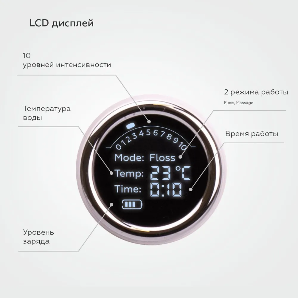 Ирригатор имеет 2 режима работы, 10 режимов разной интенсивности и высокую частоту пульсаций - до 1800 имп/мин. Прибор имеет водоустойчивый корпус и соответствует стандарту влагозащиты IPX5. Устройство работает от аккумулятора до 40 минут и полностью заряжается за 5 часов.