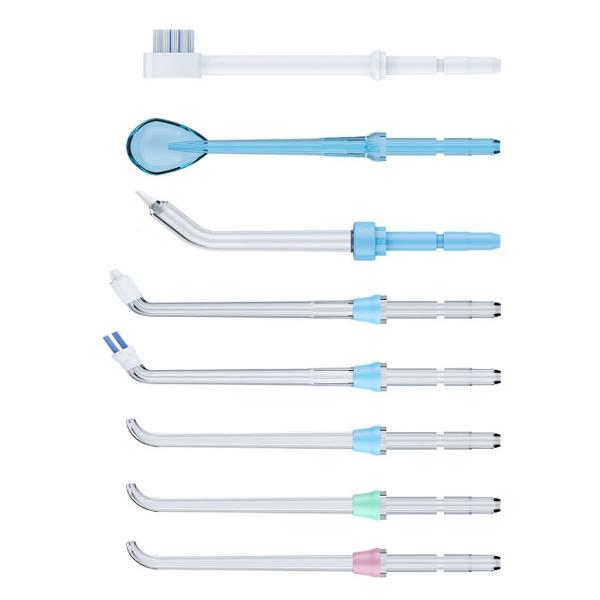Прибор поставляется с восемью насадками для деликатного очищения межзубных промежутков, десен, языка и имплантов. Для хранения насадок предусмотрен пластиковый кейс. Также представлена текстильная сумка для размещения набора.