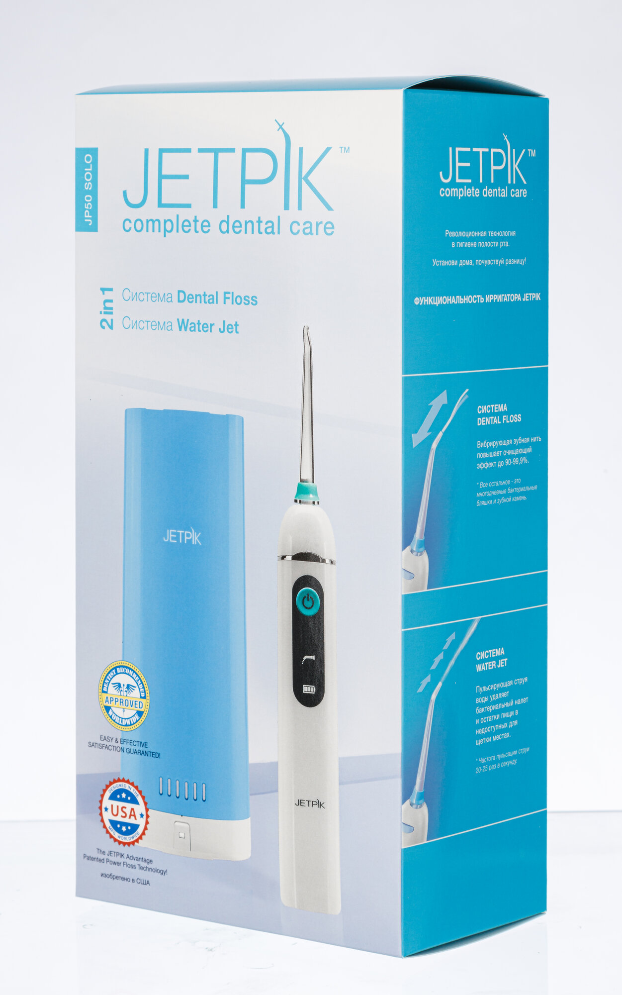 Модель Jetpik JP 50 Solo (JA05-126-02) произведена по технологии Smart-Floss, благодаря чему ее насадка оборудована вибрирующей зубной нитью. Это позволяет существенно увеличить эффект ирригации. Для наливания жидкости для орошения полости рта удобно применять бокс-стакан. С его помощью также комфортно хранить насадки, которые поставляются в комплекте. Кнопки управления моделью находятся в зоне досягаемости пальца, что обеспечивает оптимальное удобство пользователя. Благодаря компактному размеру ирригатор не занимает много места в сумке с вещами. Это оптимально для использования модели в поездке, командировке или во время дачного отдыха.