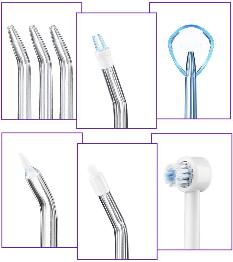 Особенности: В комплекте идут различные насадки: классические струйные, для ортодонтических конструкций, насадка для чистки языка, насадка для удаления зубного камня и налёта из-под линии десны, насадка с щёточкой для удаления налёта и вращающаяся зубная щётка.