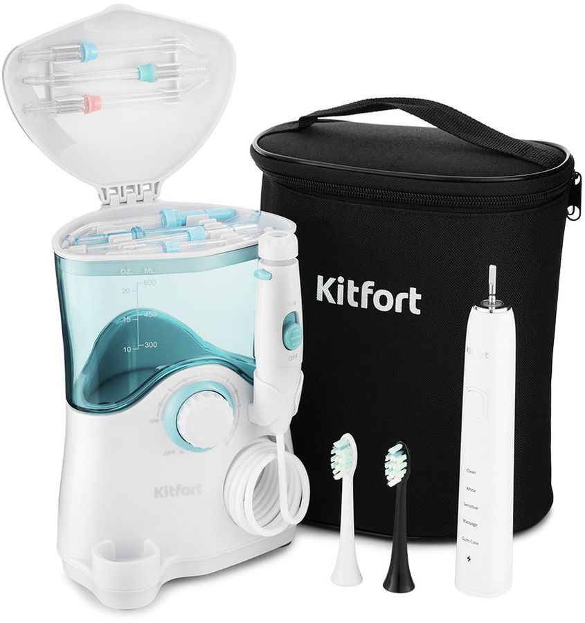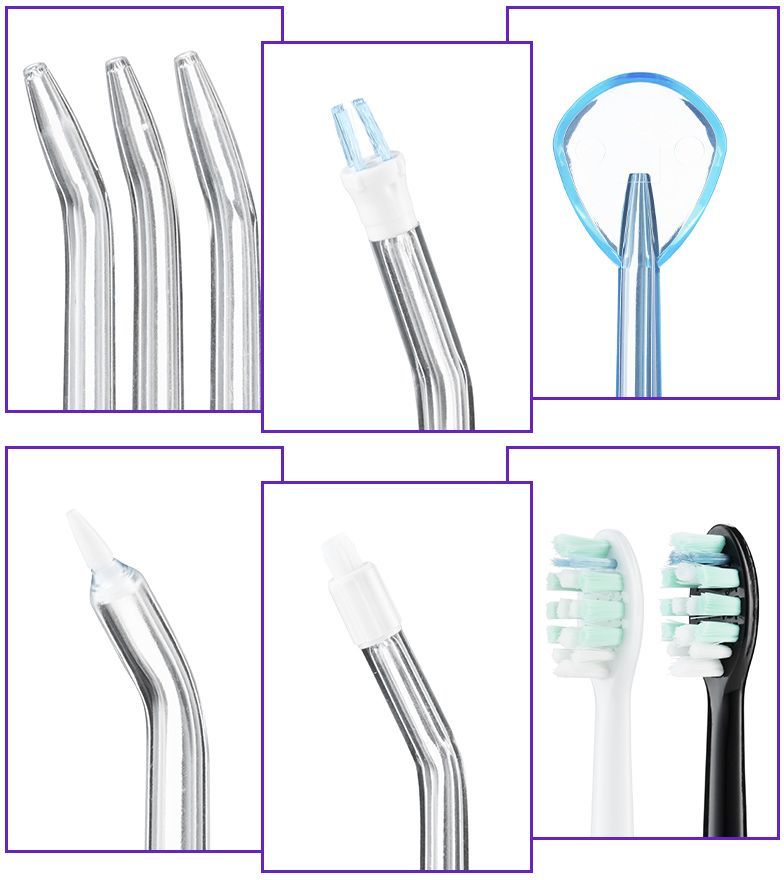 Особенности: В комплекте идут различные насадки: классические струйные насадки, насадка для ортодонтических конструкций, насадка для чистки языка, насадка для удаления зубного камня, насадка с щёточкой для удаления налёта, а также 2 насадки для зубной щётки.