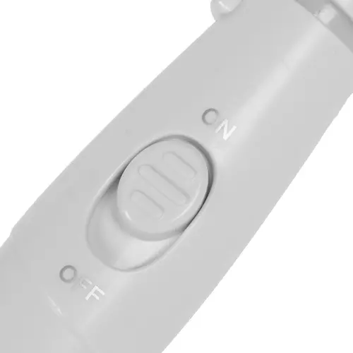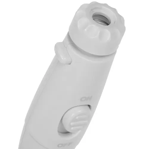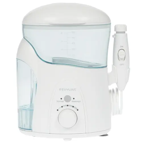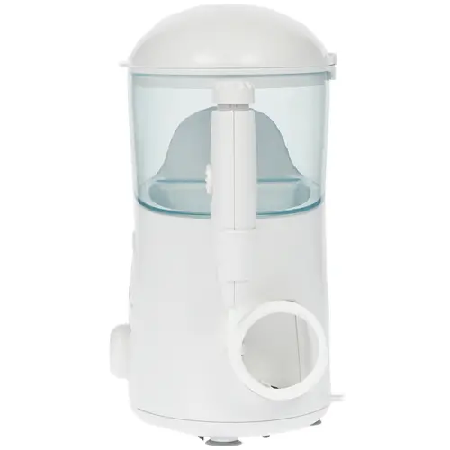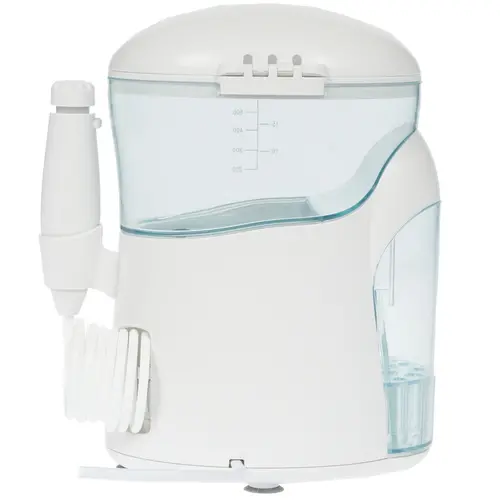 Ирригатор стационарного типа облачен в белый пластиковый корпус с резервуаром для жидкости объемом 600 мл.