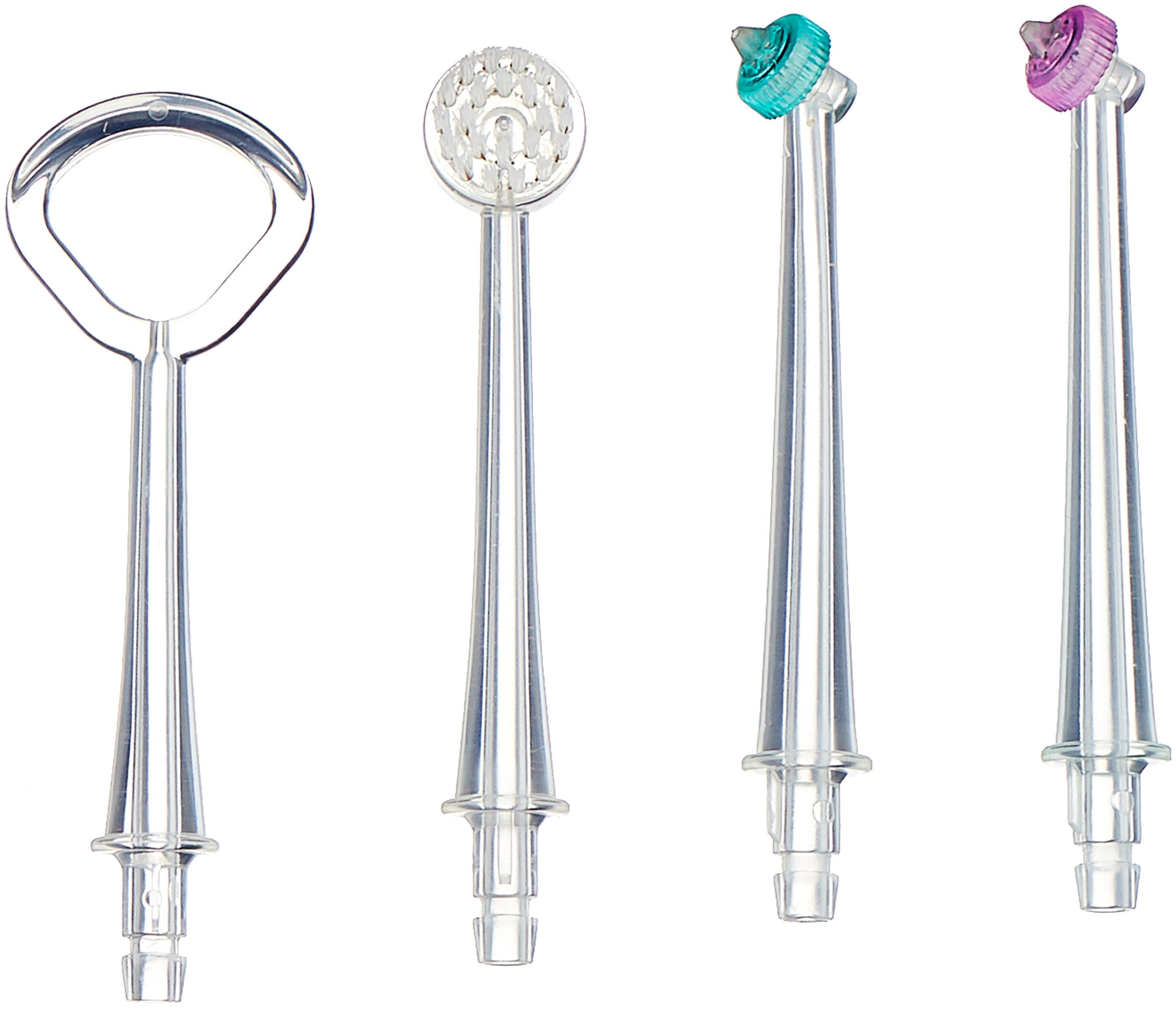в комплекте две стандартные насадки для ирригатора, насадка-щетка и насадка для чистки языка