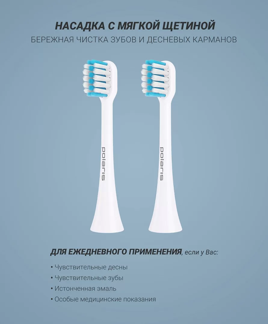 Комплект TBH 0350 BE/TC (2) из двух насадок с мягкой щетиной подходит для любой зубной щетки Polaris. Мягкая щетина рекомендована для чувствительной эмали и десен. Кончики щетинок закруглены для бережного очищения эмали. Размер головки насадки компактный, составляет 17 мм. Замену насадок необходимо производить по мере механического изнашивания и не реже 1 раза за 3 месяца использования. Белый цвет насадок универсален и подходит к щетке Polaris любого цвета.