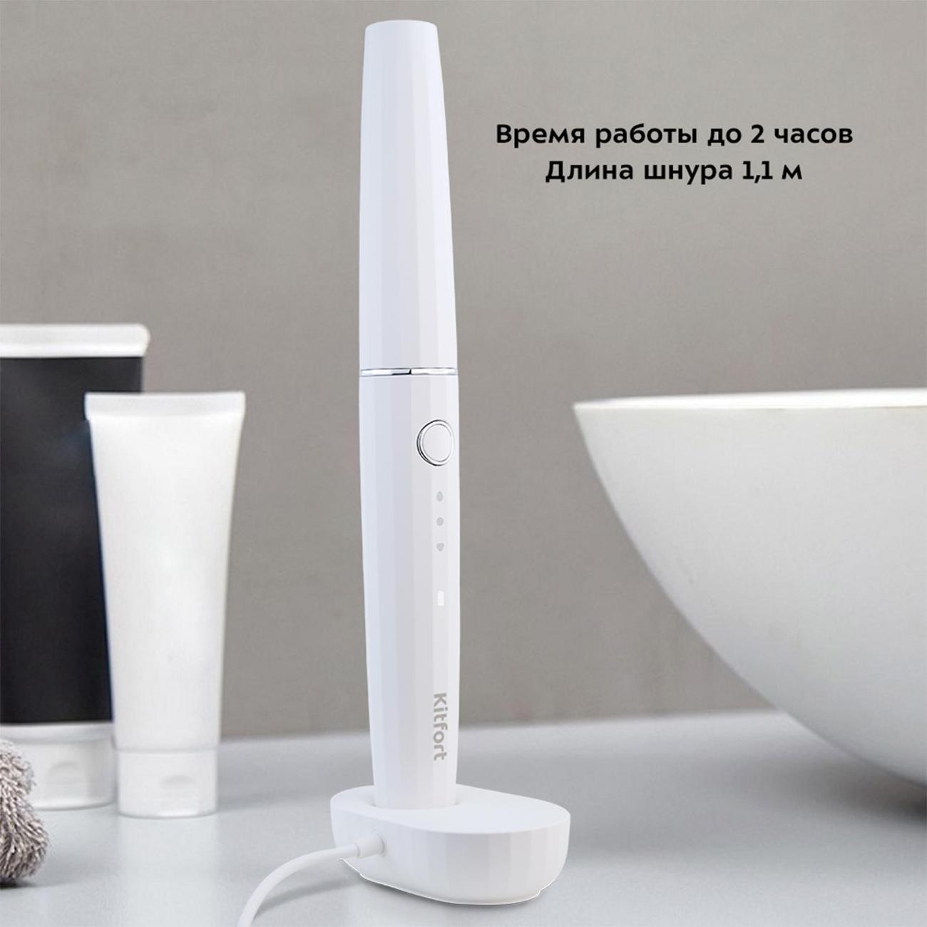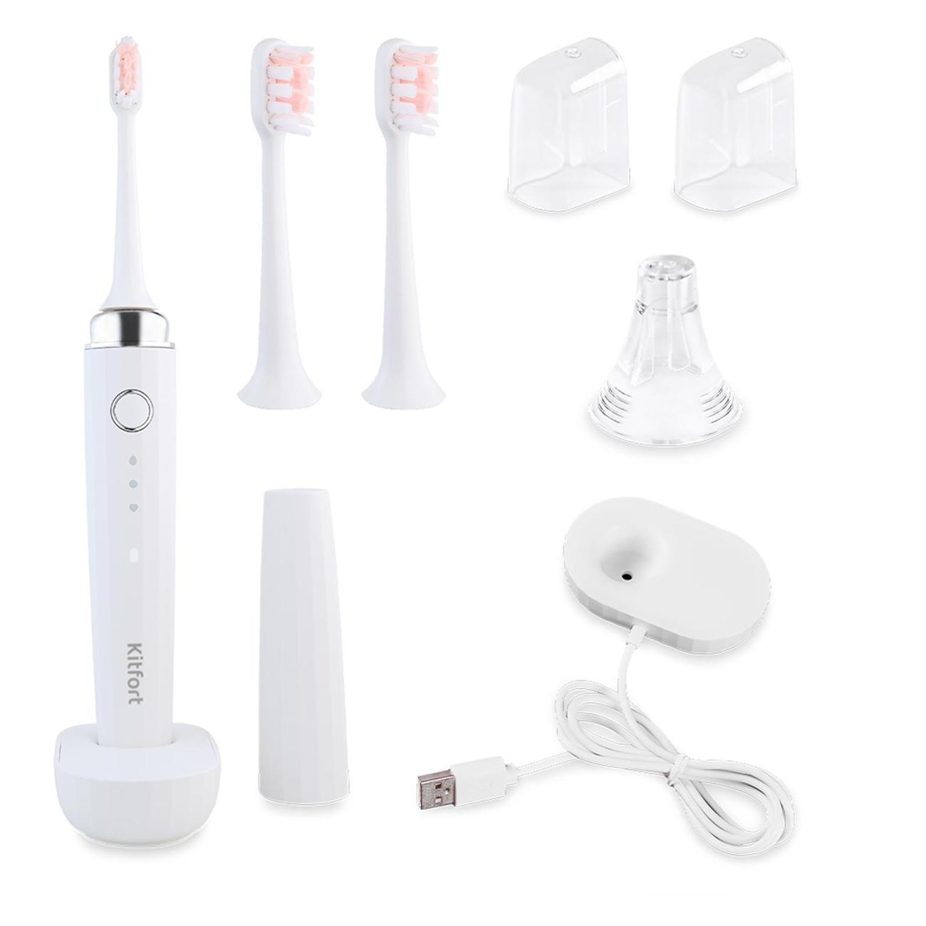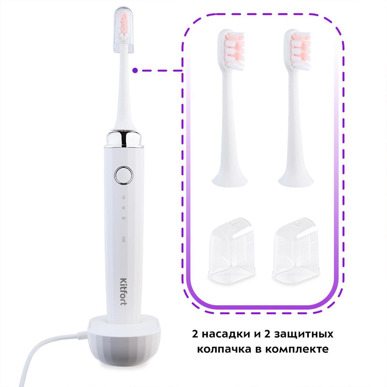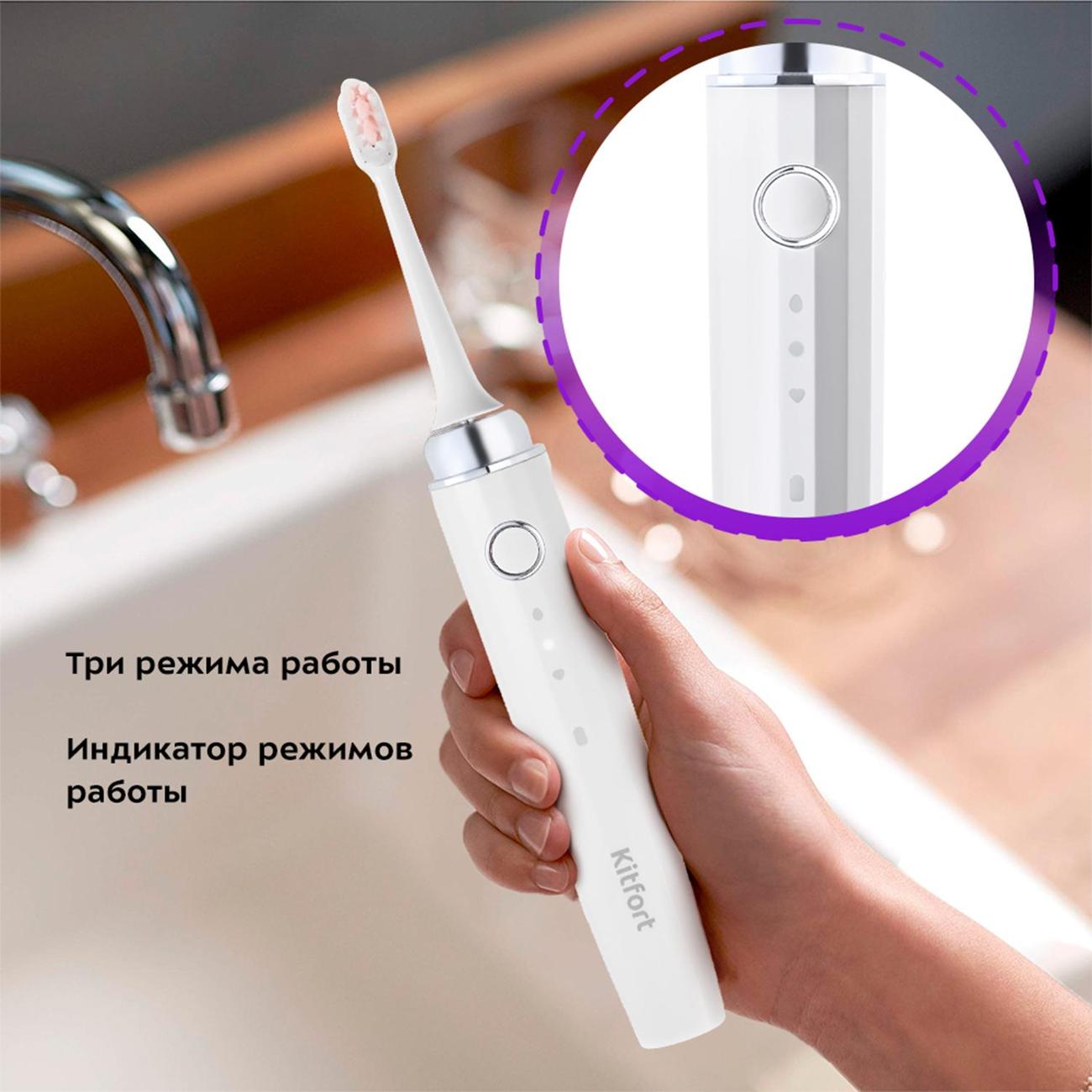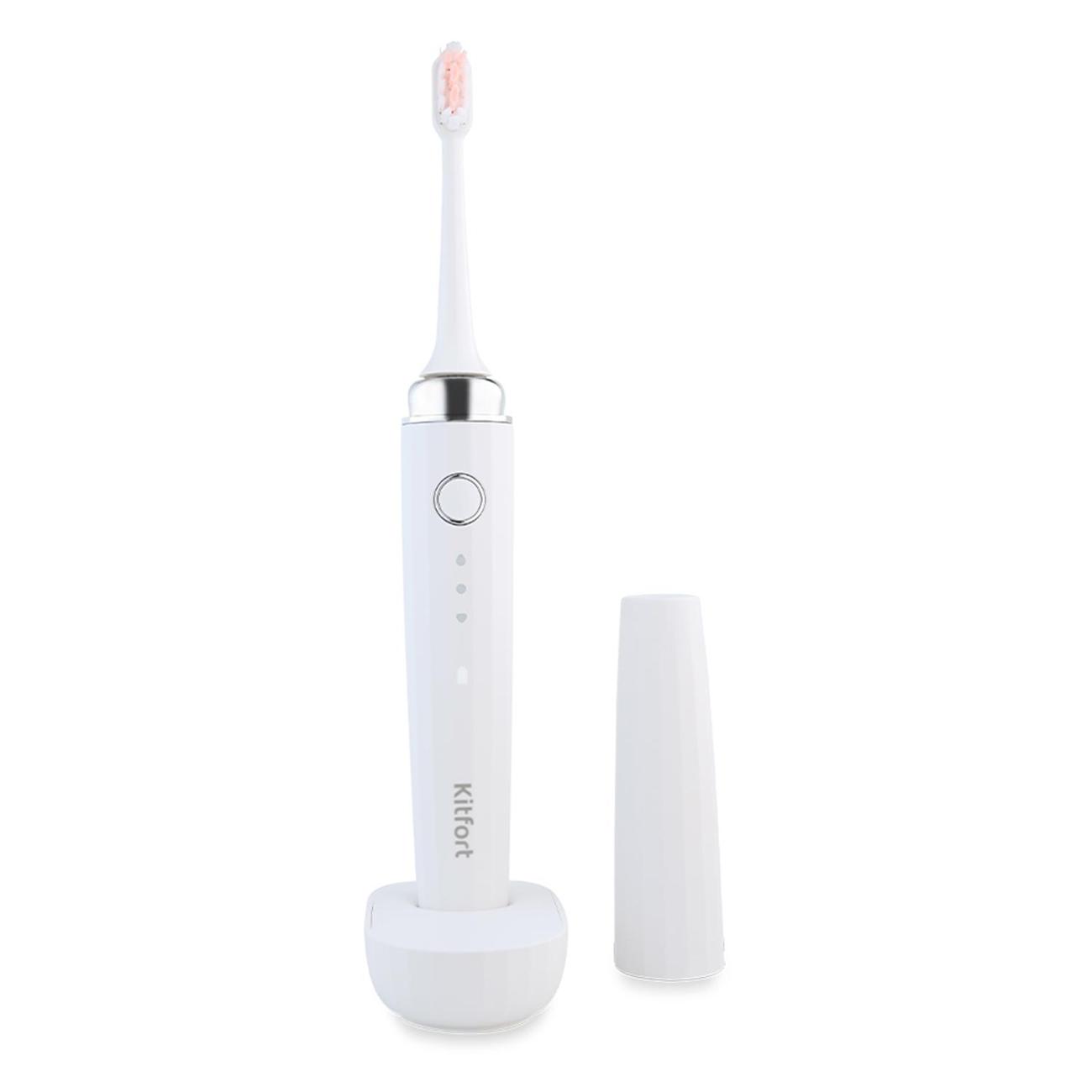 Электрическая зубная щетка Kitfort КТ-2954, белая выполняет колебания с частотой 260 Гц, снимает налет и расщепляет зубной камень, при этом головка совершает выметающие движения (от 29600 до 34000 в минуту) и тщательно все удаляет.