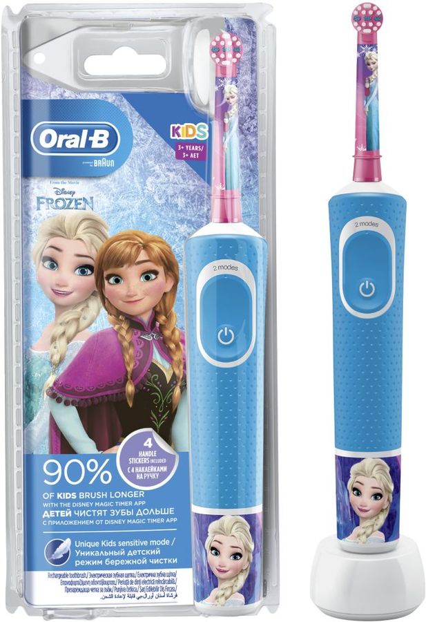 Описание Электрическая зубная щетка Oral-B Kids для детей от 3 лет с веселыми героями мультфильма Disney «Холодное Сердце» обеспечивает эффективный бережный уход за полостью рта ребенка от Oral-B.