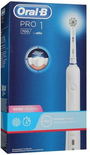 Электрическая зубная щетка Braun Oral-B PRO 700 SENSI CLEAN создана для пользователей с чувствительными зубами. Она основана на ротационном механизме и выполняет до 20000 пульсаций за минуту. Эта модель оснащена режимом деликатной чистки и датчиком нажима, который оповещает о сильном усилии нажатия на щетку. На выбор предлагаются 3 режима работы: ежедневный, отбеливающий и бережный.