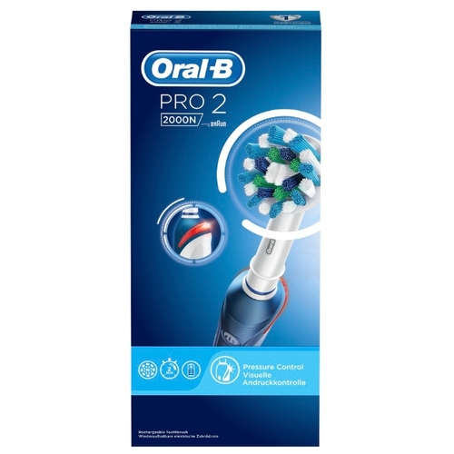 Электрическая зубная щётка Oral-B PRO 2 2000N CrossAction удаляет до двух раз больше зубного налёта, чем мануальная зубная щётка. Два режима чистки обеспечивают комплекcный уход: «Ежедневная чистка» превосходно очищает полость рта, а «Уход за дёснами» массирует дёсны, улучшая их состояние. Благодаря профессионально разработанному дизайну насадки CrossAction, щетинки, расположенные под углом, окружают каждый зуб, бережно удаляя налёт даже из труднодоступных мест и вдоль линии десны. Мягкие щетинки насадки Sensitive подойдут для очищения чувствительных участков полости рта. Визуальный датчик давления не только автоматически отключает пульсацию, но и загорается красным, помогая привыкнуть к правильной технике чистки. Закруглённые кончики щетинок защищают эмаль. Щётка оснащена водонепроницаемой эргономичной ручкой и индукционным зарядным устройством, безопасным для использования в ванной комнате. Подходит для детей с 3 лет.