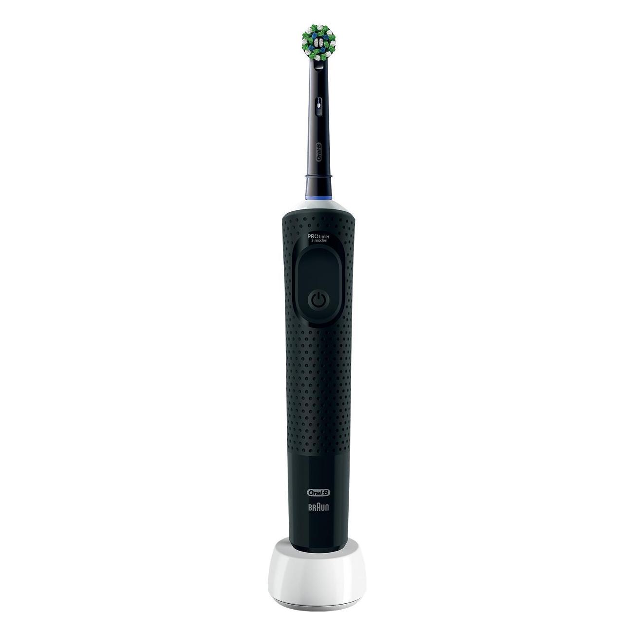 Электрическая зубная щетка Oral-B Vitality Pro черного цвета произведена на основе технологии 2D-чистки. Скорость вращательно-поступательных движений головки составляет 7600 в минуту. В комплект входит одна насадка Cross Action. Корпус зубной щетки сделан из пластика. На нем располагается световая индикация включения.