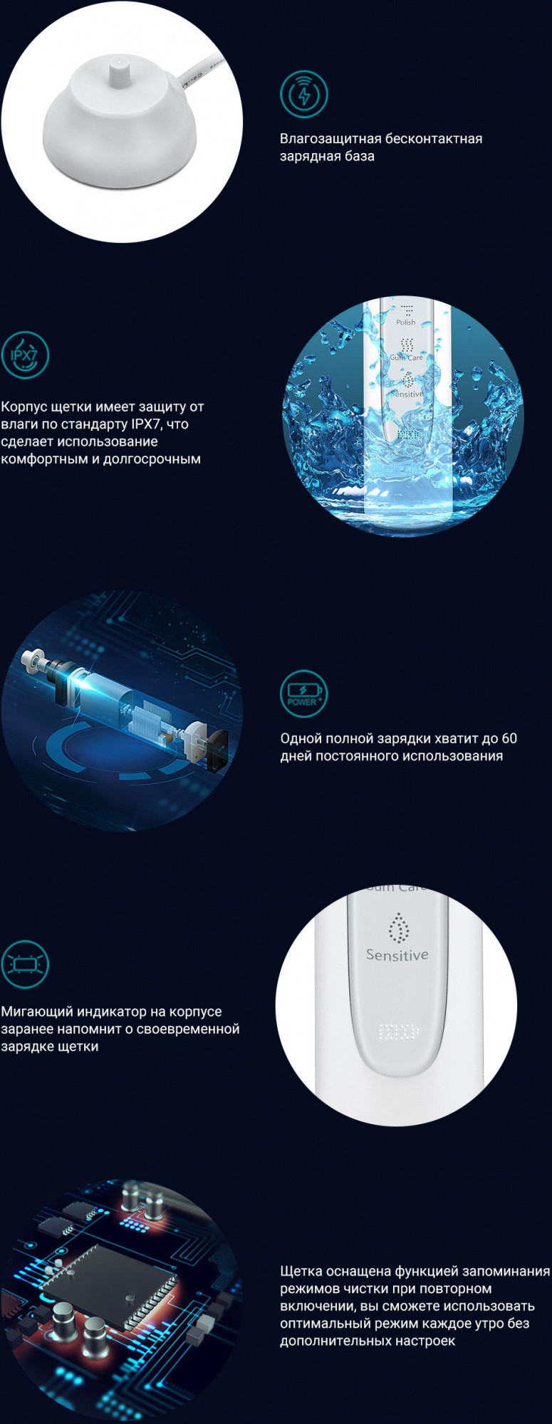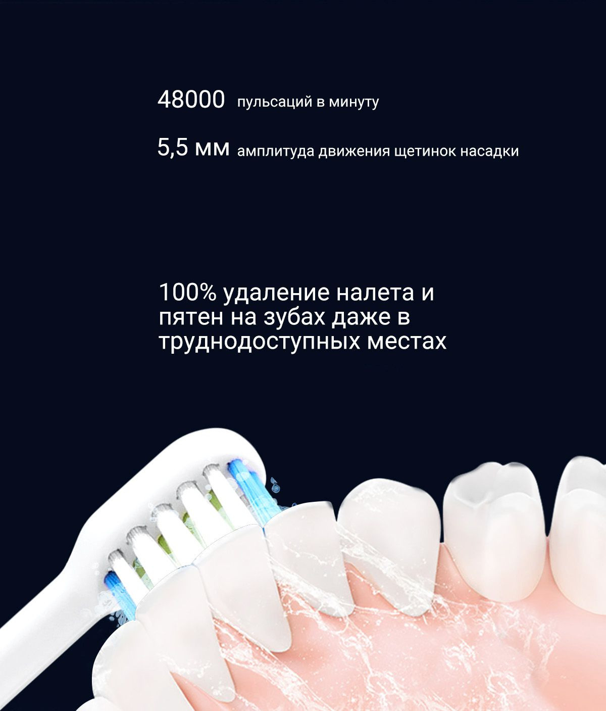 Особенности: 5 Режимов работы: Sensitive/Clean/White/Polish/Gum Care: режим Clean: 41000 пульсаций/мин, режим White: 48000 пульсаций/мин, режим Polish: 45000 пульсаций/мин, режим Gum care: 35000 пульсаций/мин, режим Sensitive: 31000 пульсаций/мин.