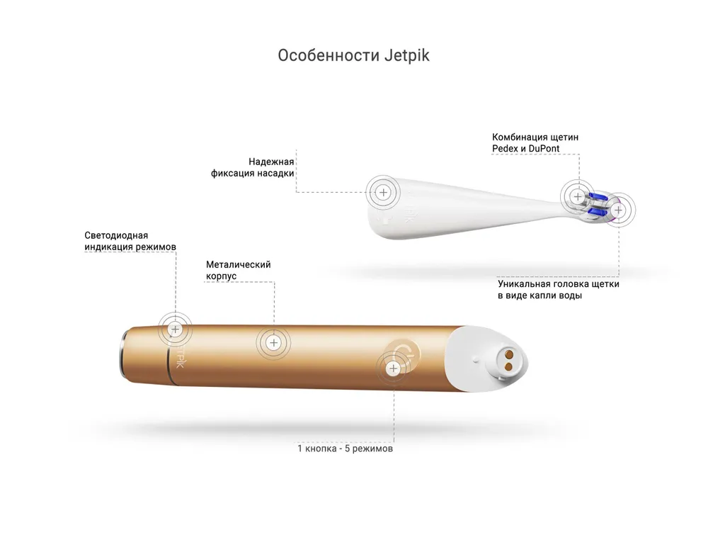 Электрическая зубная щетка Jetpik JP300 Gold применяется для тщательного очищения эмали зубов от остатков пищи. Модель имеет пять режимов работы разной интенсивности, среди которых есть «Массаж» и «Отбеливание». За счет этого поддерживается оптимальное гигиеническое состояние ротовой полости. Для оповещения пользователя об установленном режиме зубная щетка имеет световую индикацию. Встроенная батарея обеспечивает функционирование модели до 30 дней без подзарядки. Это позволяет пользователю с удобством применять устройство в рабочих поездках и путешествиях.
