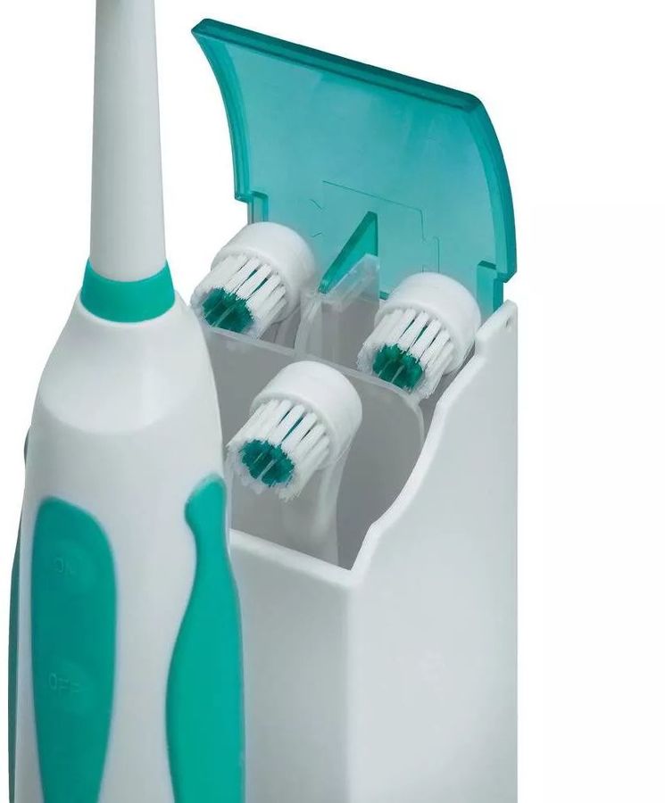 Электрическая зубная щётка с насадками и контейнером. Головка щётки с быстрыми колебательными движения (в двух направлениях) служит для нежного и эффективного удаления зубного налета. Щетка с ворсинками Tynex DuPont с закруглениями на концах для нежной очистки зубов и десен.