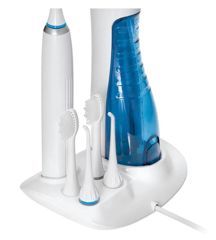 Зубной центр ProfiCare PC-DC 3031 weiss – портативный набор для качественного и самостоятельного ухода за полостью рта. Основу комплекта составляет удобная зарядная база с компактным отсеком для хранения аксессуаров, дополненная зубной щеткой с тремя насадками и ирригатором с тремя насадками. Комфортной эксплуатации способствует наличие водонепроницаемого корпуса.