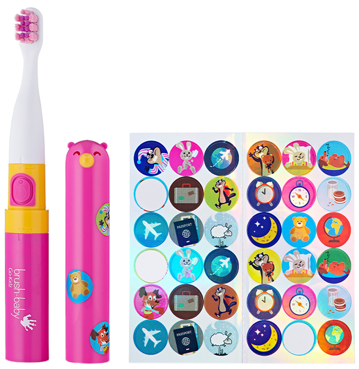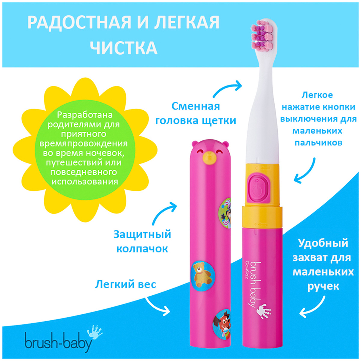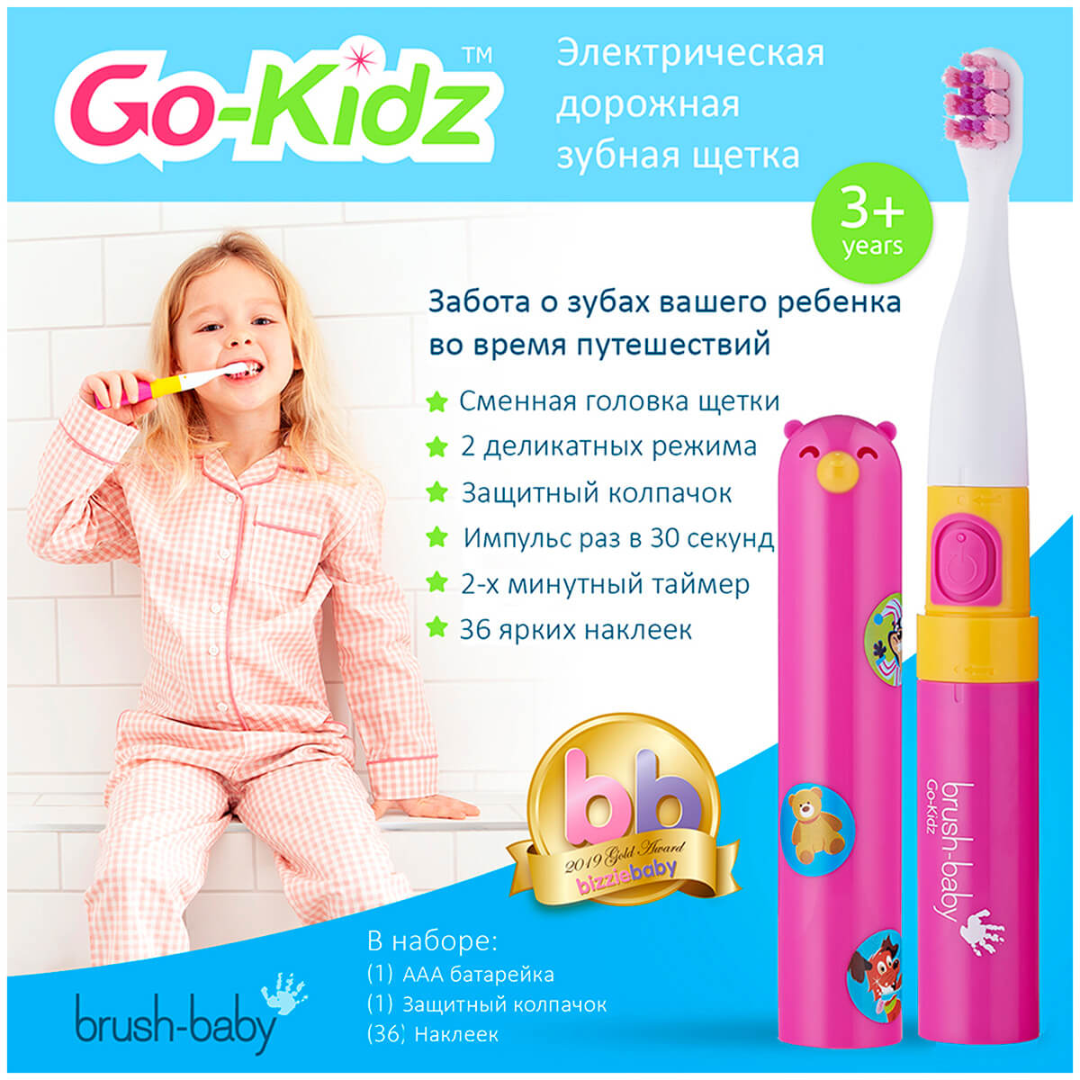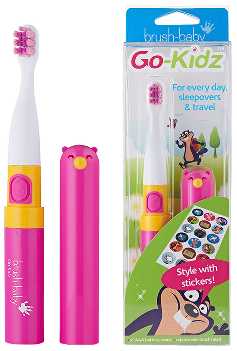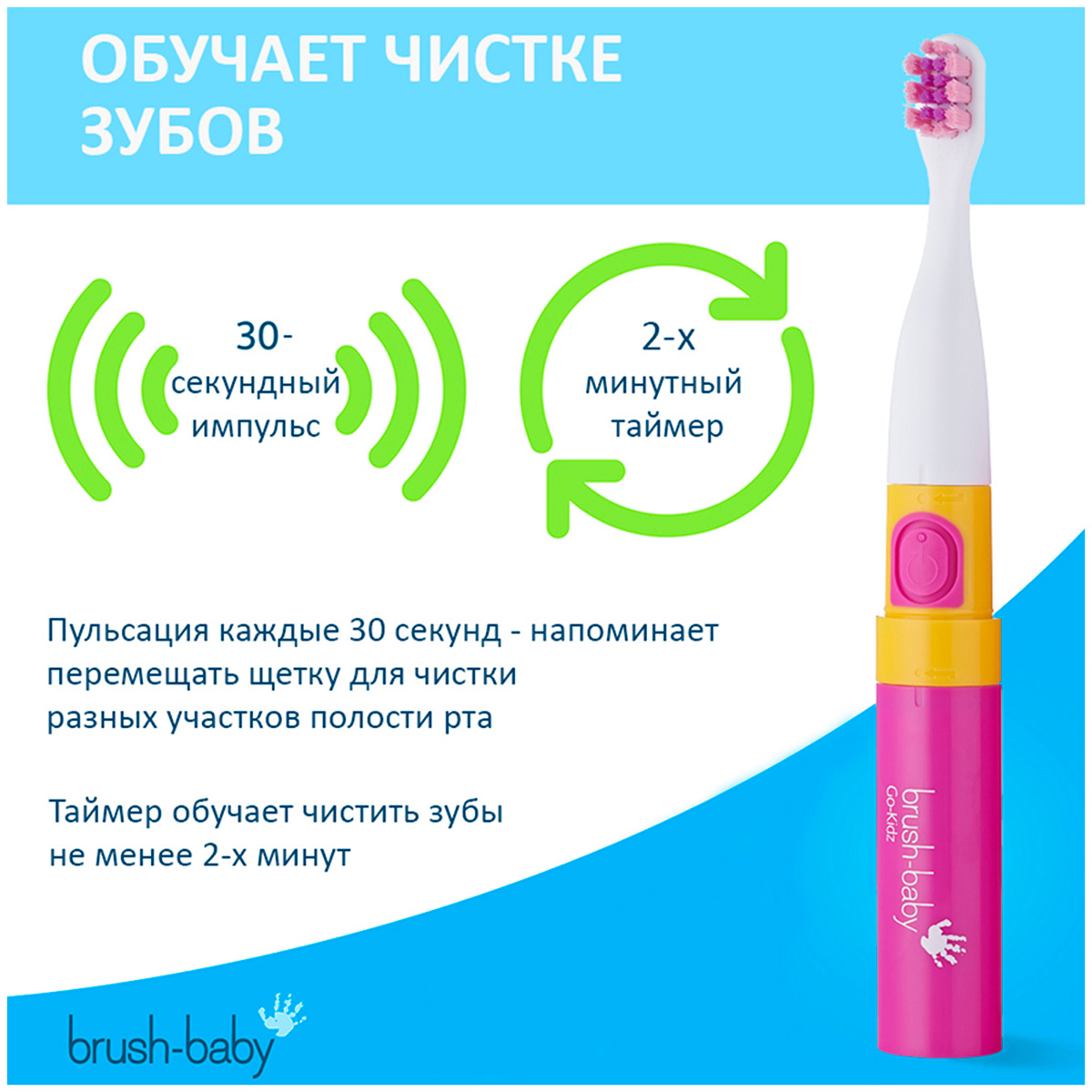 Детская электрическая зубная щётка Brush-Baby Go-Kidz розового цвета - новый продукт для ежедневного ухода за полостью рта. Позволяет малышам не только качественно заботиться о своих зубах дома, в гостях или путешествии, но и делает этот процесс увлекательным. Прибор можно применять детям с 3-х лет, он полностью безопасен.