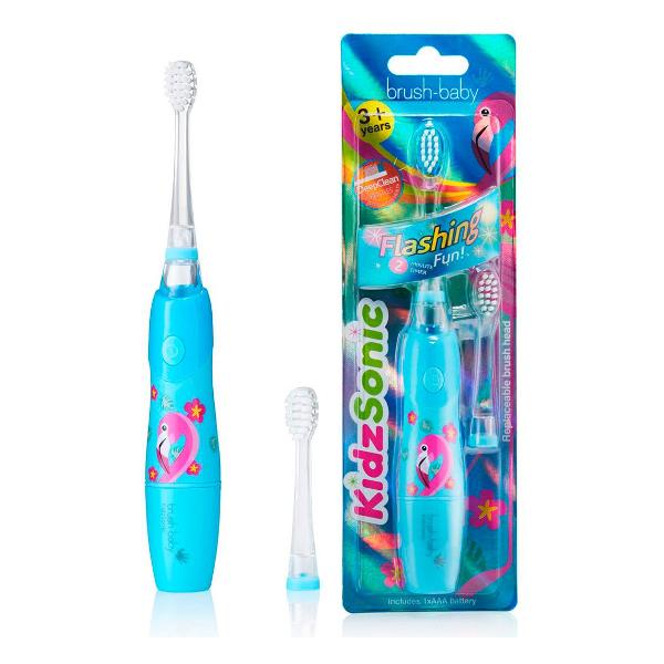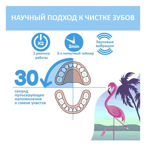 Электрическая зубная щетка Brush Baby KidzSonic «Фламинго» Blue (BRB193) - это модель, предназначенная для детей в возрасте от 3 до 6 лет. Устройство работает непрерывно на протяжении 2 минут. Приспособление поможет научить ребенка правильно чистить зубы с помощью индикации. Вибрационный импульс срабатывает каждые 30 секунд, напоминая о необходимости смены зоны обработки. Световой сигнал оповестит об окончании процедуры.