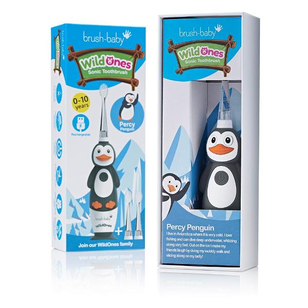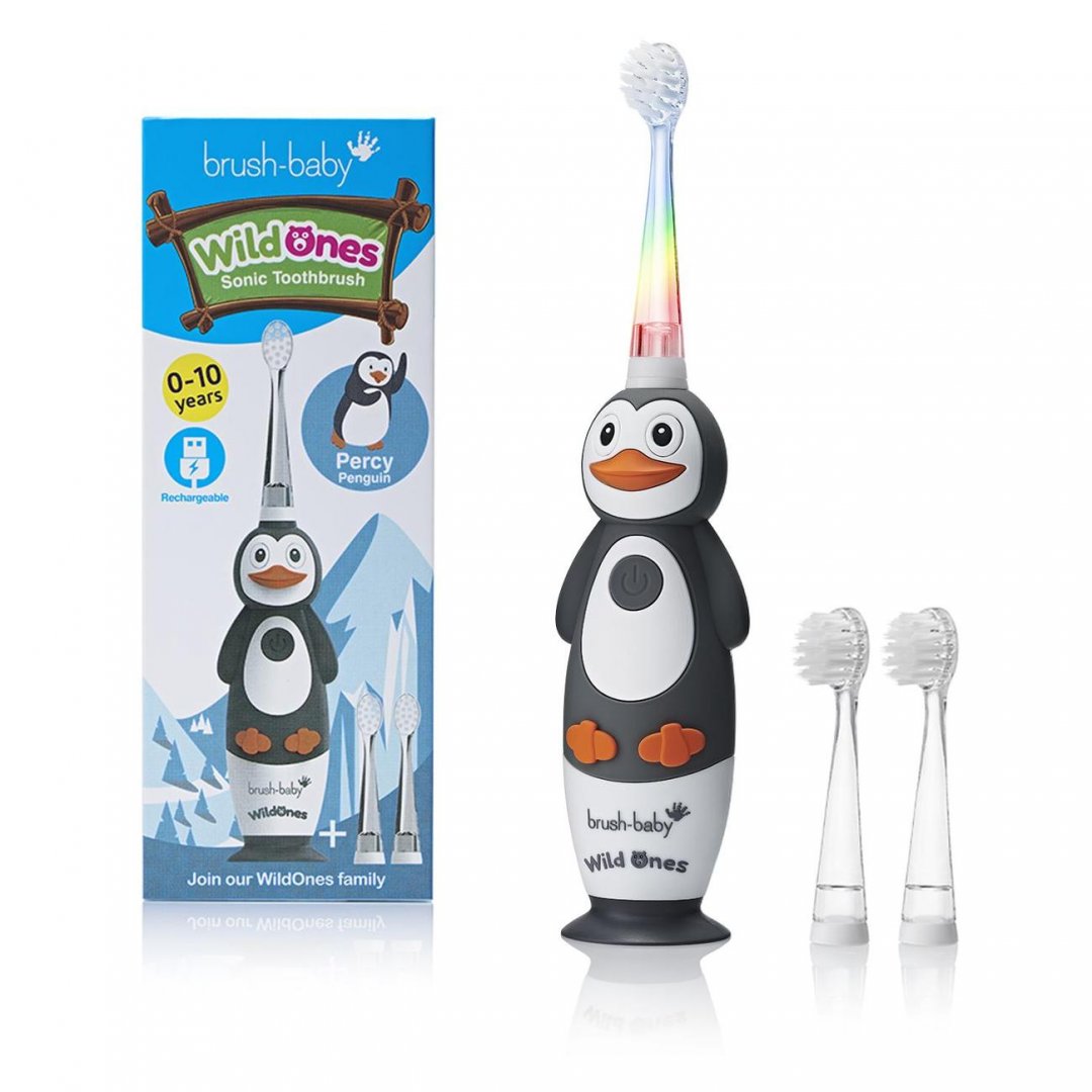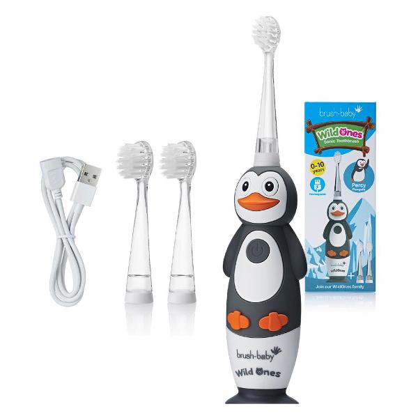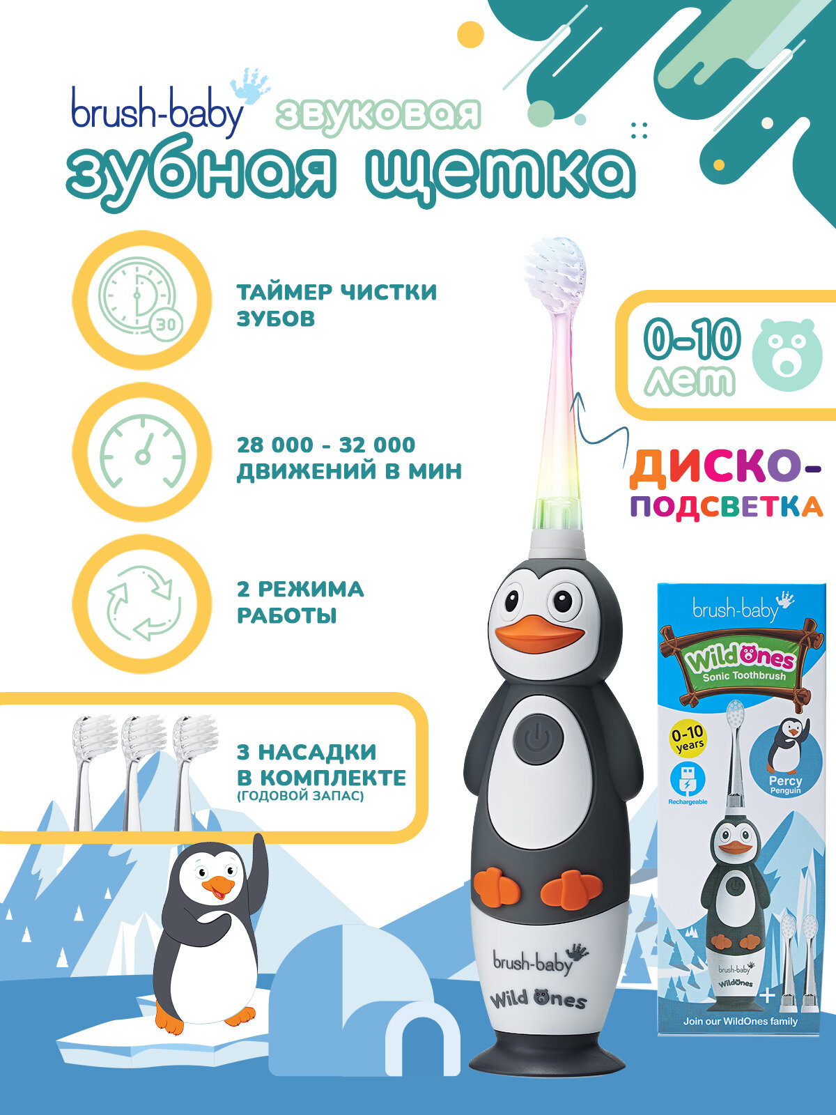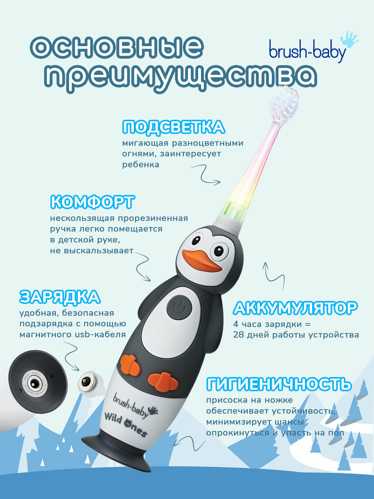 Черная электрическая зубная щетка Brush Baby Sonic WildOnes «Пингвин» (BRB240) заряжается при помощи магнитного кабеля. Зарядки в течение 4 часов хватает на 28 дней работы устройства. Щетка работает на двух скоростях. Конструкция отличается абсолютной влагонепроницаемостью. Встроенный таймер программируется на 2 минуты. На удобной ручке сделано прорезиненное покрытие, исключающее выскальзывание щетки из руки. Но ножке находится присоска для прочной фиксации на поверхности. В комплектацию включена сменная насадка.