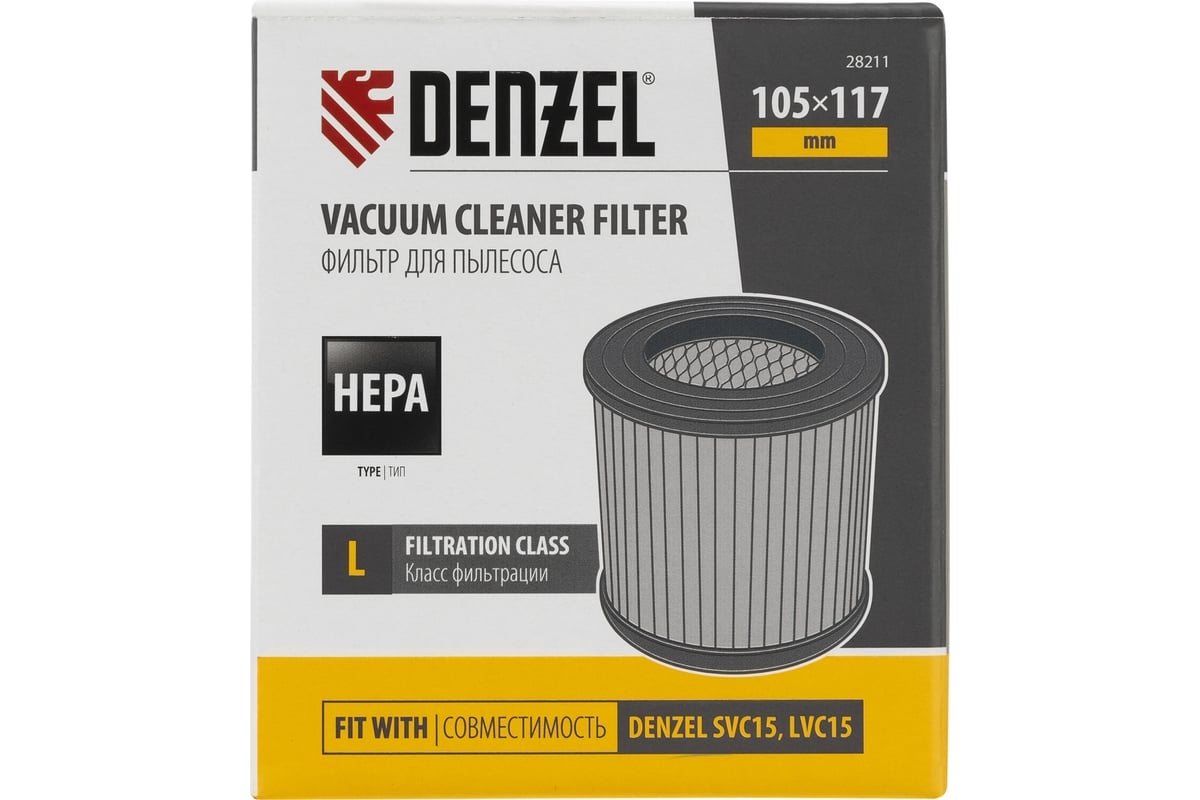 Каркасный складчатый HEPA-фильтр Denzel 28211 совместим со строительными пылесосами SVC15 (28201), LVC15 (28291). Устанавливается на корпус фильтра пылесоса и используется для проведения сухой уборки. Имеет класс фильтрации L, успешно справляется с частичками лака, краски, искусственного камня и т.п.