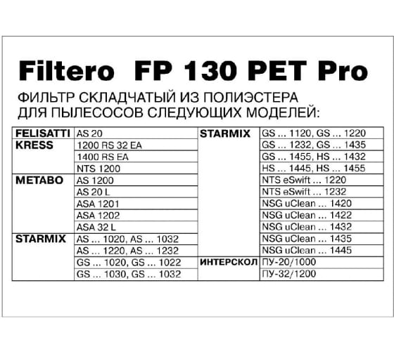Технические характеристики фильтра для пылесосов KRESS, METABO, STARMIX, ИНТЕРСКОЛ FILTERO 05795