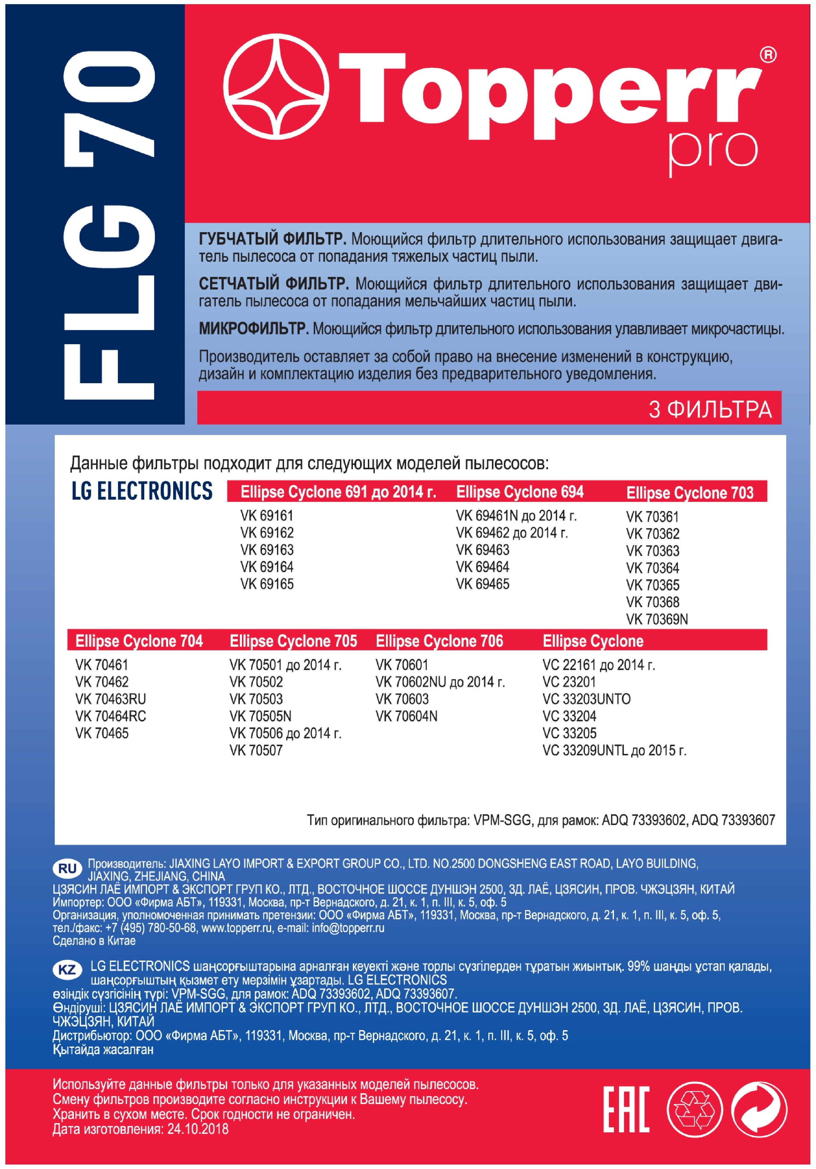 Комплект фильтров FLG 70 предназначен для пылесосов LG ELECTRONICS серии Ellipse Cyclone.