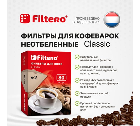 Фильтры для кофе, №2, 80 шт., корич FILTERO 2/80 используются с кофемашинами капельного типа для очистки жидкости от мелких частиц молотого кофе. При этом вкус и цвет напитка не меняются.
