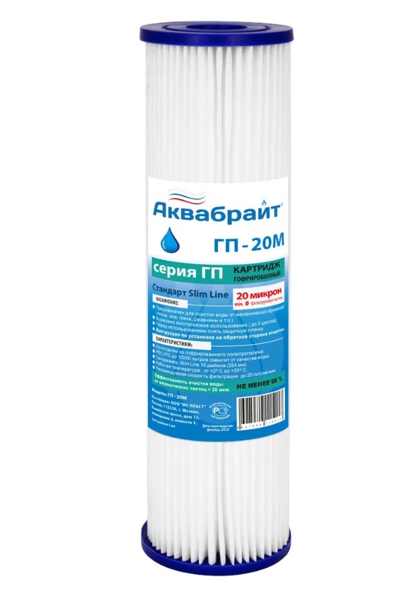 Картридж АКВАБРАЙТ ГП-20М из гофрированного полипропилена с пищевым допуском.